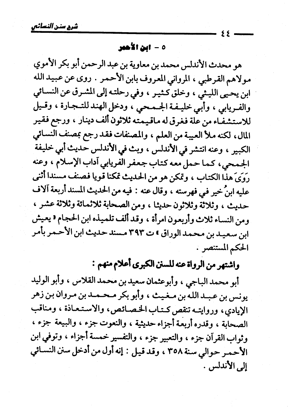 هو محدث الأندلس محمَّد بن معاوية بن عبد الرحمن أبو بكر الأموي مولاهم القرطبي، المرواني المعروف بابن الأحمر. روى عن عبيد الله ابن يحيى الليثي، وخلق كثير، وفي رحلته إلى المشرق عن النسائي والفريابي، وأبي خليفة الجمحي، ودخل الهند للتجارة، وقيل للاستشفاء من علة فغرق له ما قيمته ثلاثون ألف دينار، ورجع فقير المال، لكنه ملأ العيبة من العلم، والمصنفات فقد رجع بمصنف النسائي الكبير، وعنه انتشر في الأندلس، وبث في الأندلس حديث أبي خليفة الجمحي، كما حمل معه كتاب جعفر الفريابي آداب الإسلام، وعنه رَوَىَ هذا الكتاب، وتمكن هو من الحديث تمكنا قويا فصنف مسندا أثنى عليه ابنُ خير في فهرسته، وقال عنه: فيه من الحديث المسند أربعة آلاف حديث، وثلاثة وثلاثون حديثا، ومن الصحابة ثلاثمائة وثلاثة عشر، ومن النساء ثلاث وأربعون امرأة، وقد ألف تلميذه ابن الحجام "يعيش ابن سعيد بن محمد الوراق" ت 393 مسند حديث ابن الأحمر بأمر الحكم المستنصر.
