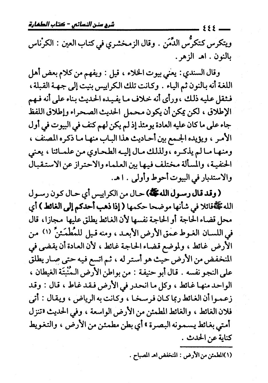 وقال السندي: يعني بيوت الخلاء، قيل: ويفهم من كلام بعض أهل اللغة أنه بالنون ثم الياء. وكانت تلك الكراييس بنيت إلى جهة القبلة، فثقل عليه ذلك، ورأى أنه خلاف ما يفيده الحديث بناء على أنه فهم الإطلاق، لكن يمكن أن يكون محمل الحديث الصحراء وإطلاق اللفظ جاء على ما كان عليه العادة يومئذ إذ لم يكن لهم كنف في البيوت في أول الأمر، ويؤيده الجمع بين أحاديث هذا الباب منها ما ذكره المصنف، ومنها ما لم يذكره، ولذلك مال إليه الطحاوي من علمائنا، يعني الحنفية، والمسألة مختلف فيها بين العلماء والاحتراز عن الاستقبال والاستدبار في البيوت أحوط وأولى. اهـ.