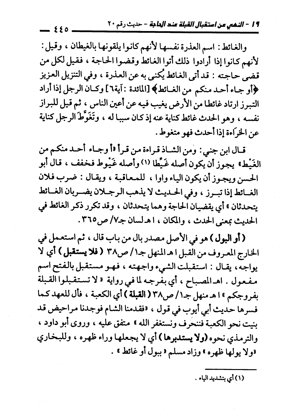 (أو البول) هو في الأصل مصدر بال من باب قال، ثم استعمل في الخارج المعروف من القبل اهـ المنهل جـ 1/ ص 38 (فلا يستقبل) أي لا يواجه، يقال: استقبلت الشيء واجهته، فهو مستقبل بالفتح اسم مفعول. اهـ المصباح، أي بفرجه لما في رواية "لا تستقبلوا القبلة بفروجكم" اهـ منهل جـ 1/ ص 38 (القبلة) أي الكعبة، فأل للعهد كما فسرها حديث أبي أيوب في قول، "فقدمنا الشام فوجدنا مراحيض قد بنيت نحو الكعبة فننحرف ونستغفر الله" متفق عليه، وروى أبو داود، والترمذي نحوه (ولا يستدبرها) أي لا يجعلها وراء ظهره، وللبخاري "ولا يولها ظهره" وزاد مسلم "ببول أو غائط".