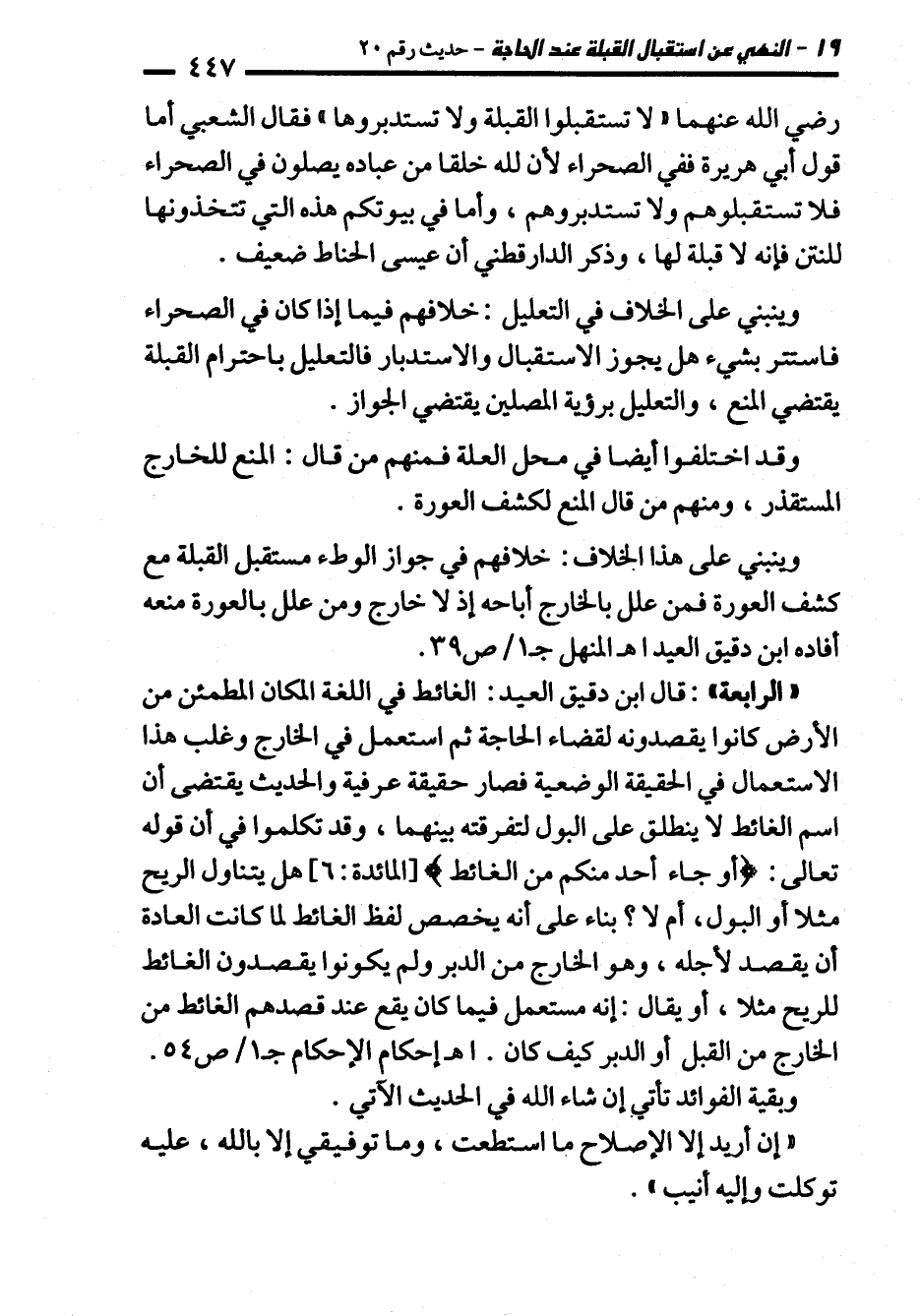 رضي الله عنهما "لا تستقبلوا القبلة ولا تستدبروها" فقال الشعبي أما قول أبي هريرة ففي الصحراء لأن لله خلقا من عباده يصلون في الصحراء فلا تستقبلوهم ولا تستدبروهم، وأما في بيوتكم هذه التي تتخذونها للنتن فإنه لا قبلة لها، وذكر الدارقطني أن عيسى الحناط ضعيف.