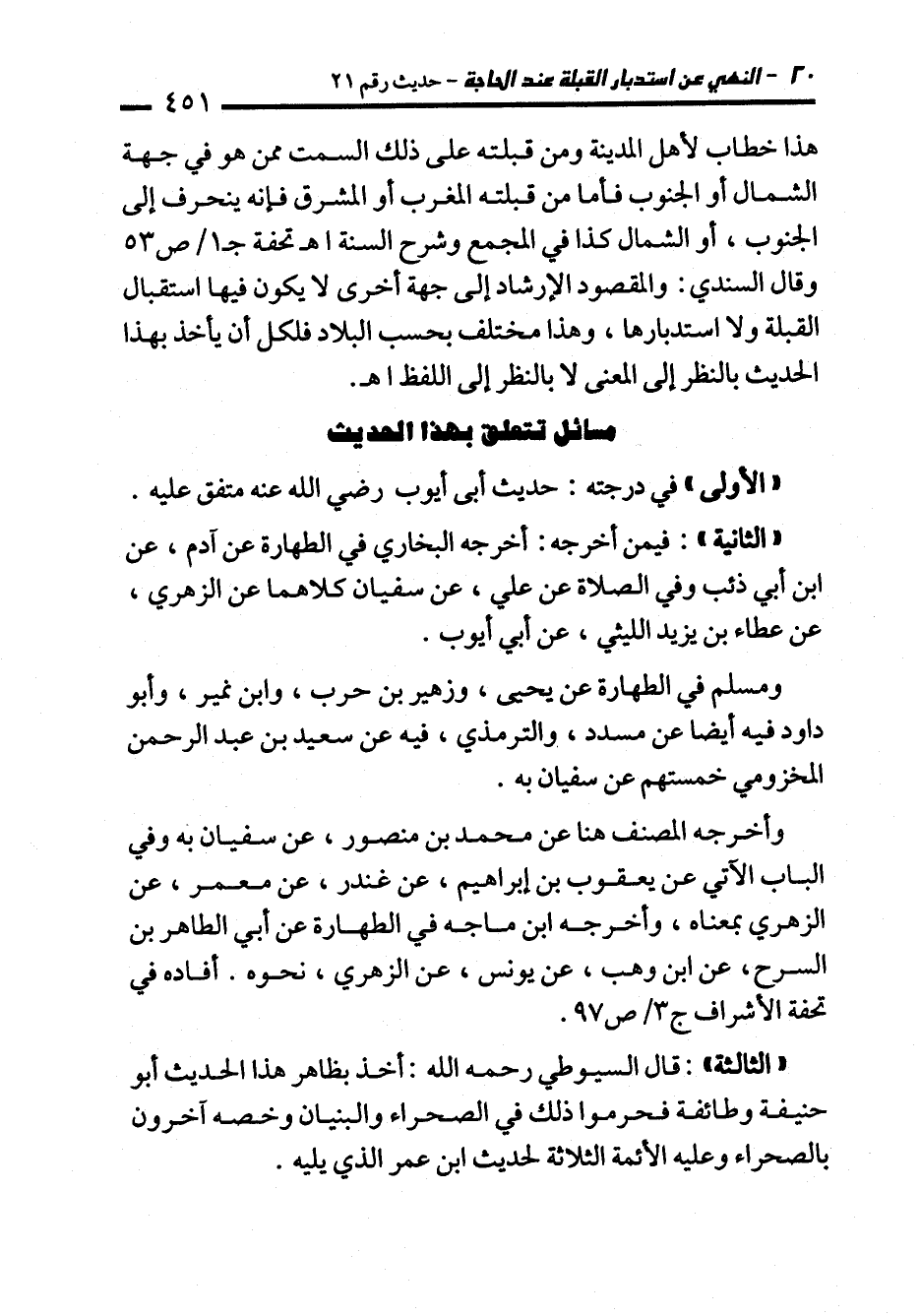 "الثالثة": قال السيوطي رحمه الله: أخذ بظاهر هذا الحديث أبو حنيفة وطائفة فحرموا ذلك في الصحراء والبنيان وخصه آخرون بالصحراء وعليه الأئمة الثلاثة لحديث ابن عمر الذي يليه.