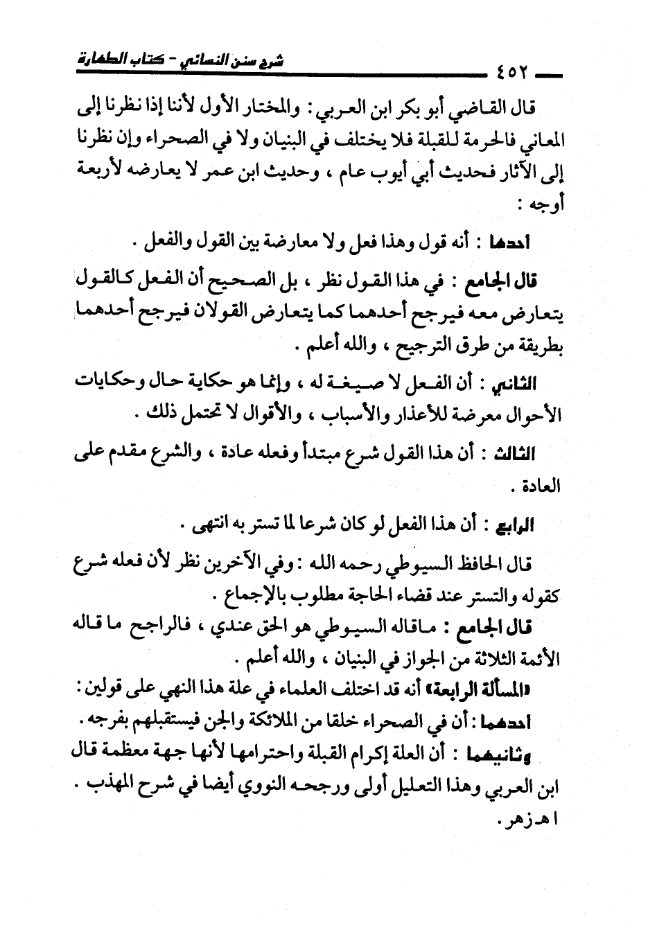 قال القاضي أبو بكر ابن العربي: والمختار الأول لأننا إذا نظرنا إلى المعاني فالحرمة للقبلة فلا يختلف في البنيان ولا في الصحراء وإن نظرنا إلى الآثار فحديث أبي أيوب عام، وحديث ابن عمر لا يعارضه لأربعة أوجه: