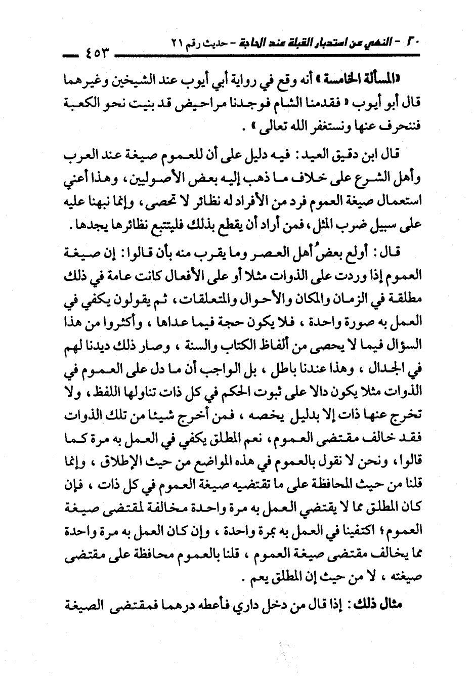 قال ابن دقيق العيد: فيه دليل على أن للعموم صيغة عند العرب وأهل الشرع على خلاف ما ذهب إليه بعض الأصوليين، وهذا أعني استعمال صيغة العموم فرد من الأفراد له نظائر لا تحصى، وإنما نبهنا عليه على سبيل ضرب المثل، فمن أراد أن يقطع بذلك فليتتبع نظائرها يجدها.