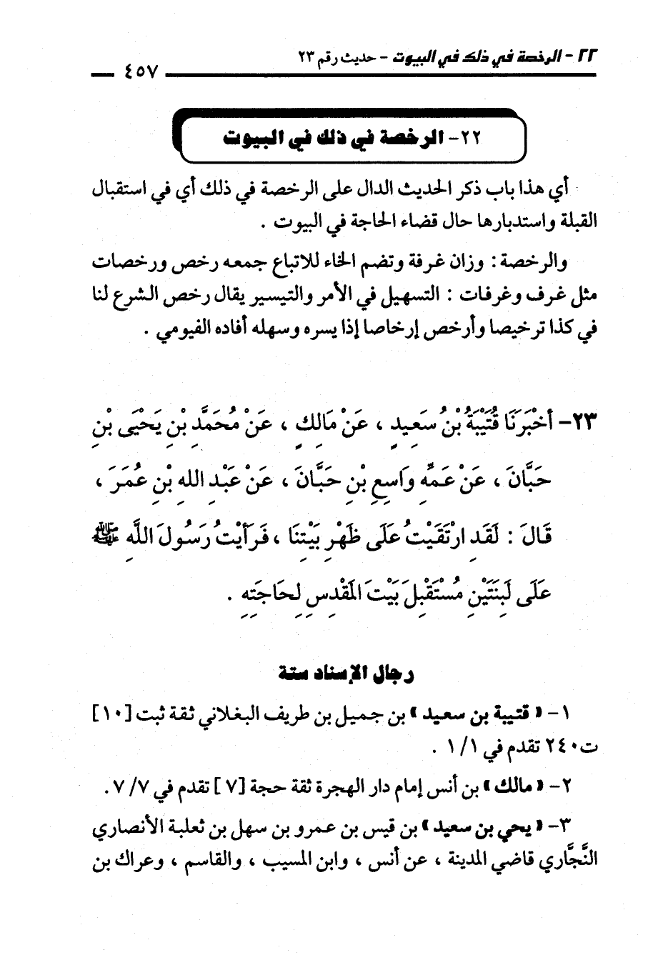 23 - أَخْبَرَنَا قُتَيْبَةُ بْنُ سَعِيدٍ، عَنْ مَالِكٍ، عَنْ مُحَمَّدِ بْنِ يَحْيَى بْنِ حَبَّانَ، عَنْ عَمِّهِ وَاسِعِ بْنِ حَبَّانَ، عَنْ عَبْدِ اللهِ بْنِ عُمَرَ، قَالَ: لَقَدِ ارْتَقَيْتُ عَلَى ظَهْرِ بَيْتِنَا، فَرَأَيْتُ رَسُولَ اللهِ - صلى الله عليه وسلم - عَلَى لَبِنَتَيْنِ مُسْتَقْبِلَ بَيْتِ الْمَقْدِسِ لِحَاجَتِهِ.