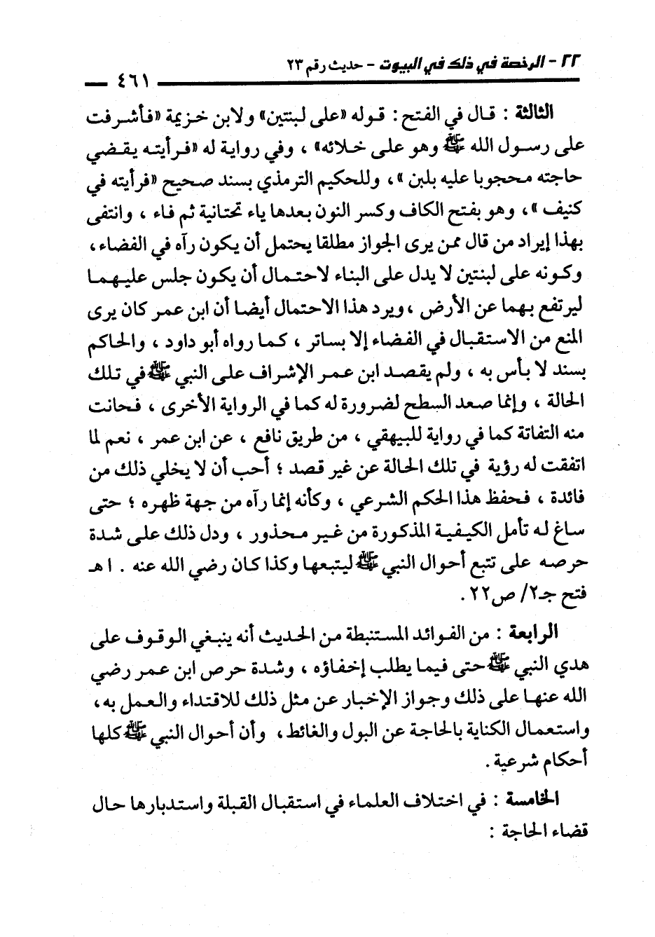 الرابعة: من الفوائد المستنبطة من الحديث أنه ينبغي الوقوف على هدي النبي - صلى الله عليه وسلم - حتى فيما يطلب إخفاؤه، وشدة حرص ابن عمر رضي الله عنها على ذلك وجواز الإخبار عن مثل ذلك للاقتداء والعمل به، واستعمال الكناية بالحاجة عن البول والغائط، وأن أحوال النبي - صلى الله عليه وسلم - كلها أحكام شرعية.