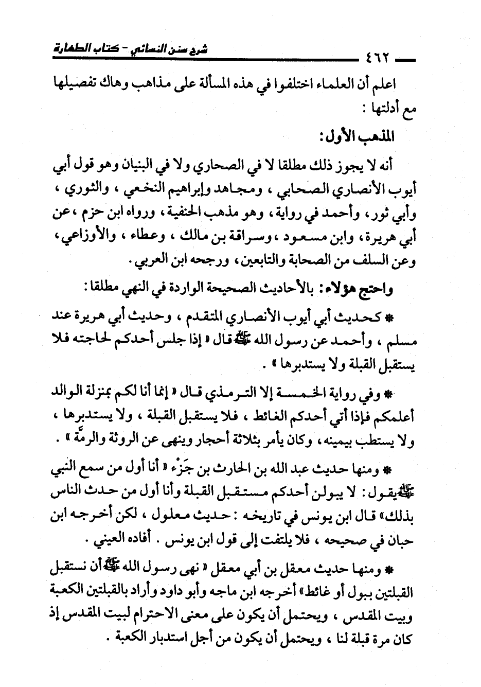 * كحديث أبي أيوب الأنصاري المتقدم، وحديث أبي هريرة عند مسلم، وأحمد عن رسول الله - صلى الله عليه وسلم - قال "إذا جلس أحدكم لحاجته فلا يستقبل القبلة ولا يستدبرها".