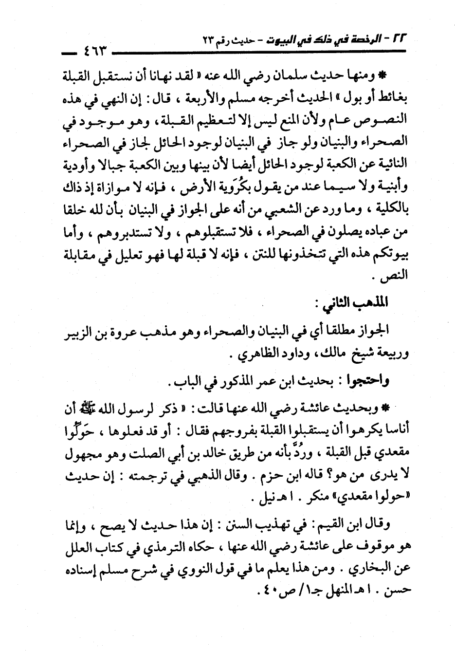 * ومنها حديث سلمان رضي الله عنه "لقد نهانا أن نستقبل القبلة بغائط أو بول" الحديث أخرجه مسلم والأربعة، قال: إن النهي في هذه النصوص عام ولأن المنع ليس إلا لتعظيم القبلة، وهو موجود في الصحراء والبنيان ولو جاز في البنيان لوجود الحائل لجاز في الصحراء النائية عن الكعبة لوجود الحائل أيضا لأن بينها وبين الكعبة جبالا وأودية وأبنية ولا سيما عند من يقول بكُرَوية الأرض، فإنه لا موازاة إذ ذاك بالكلية، وما ورد عن الشعبي من أنه على الجواز في البنيان بأن لله خلقا من عباده يصلون في الصحراء، فلا تستقبلوهم، ولا تستدبروهم، وأما بيوتكلم هذه التي تتخذونها للنتن، فإنه لا قبلة لها فهو تعليل في مقابلة النص.