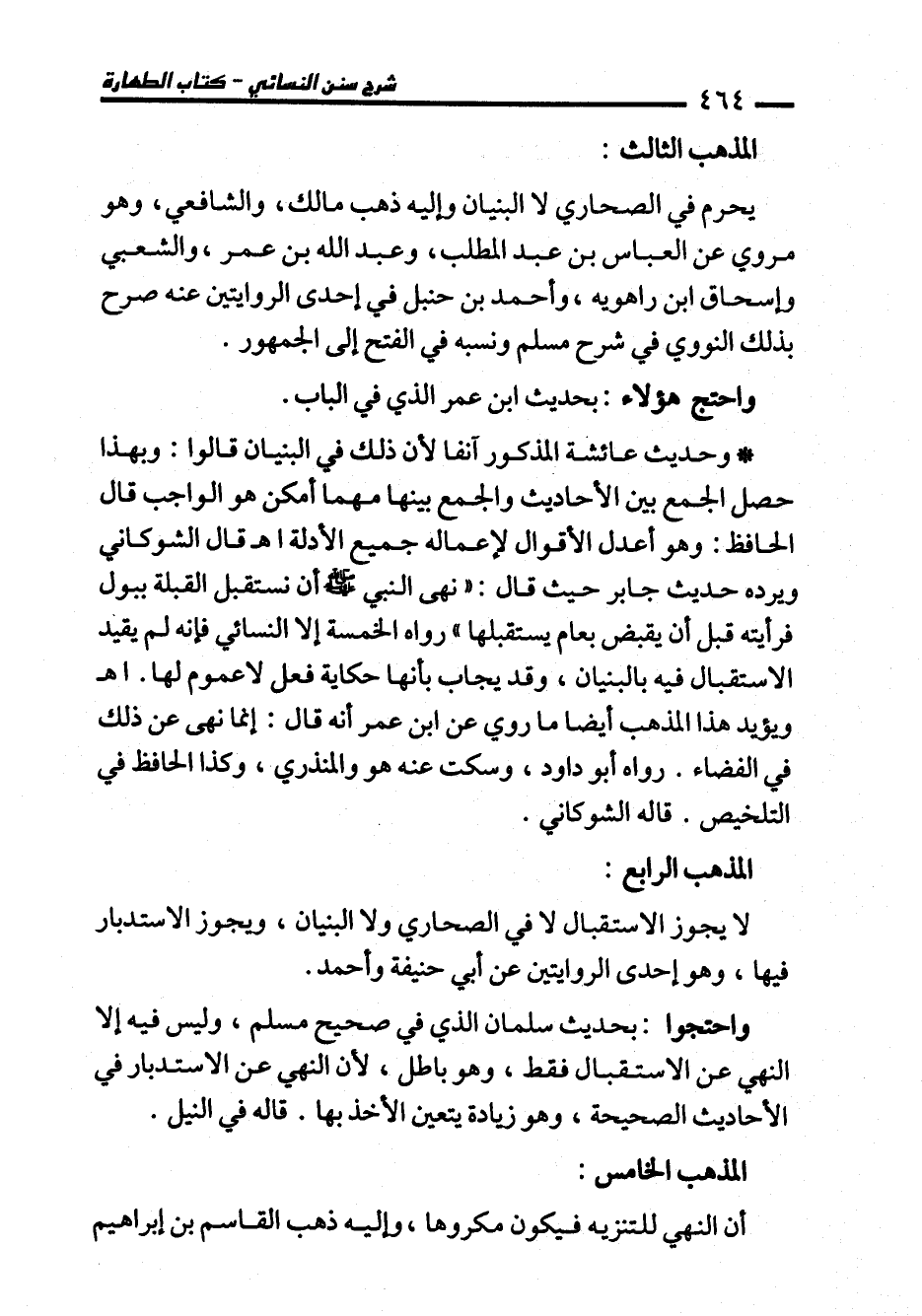 * وحديث عائشة المذكور آنفا لأن ذلك في البنيان قالوا: وبهذا حصل الجمع بين الأحاديث والجمع بينها مهما أمكن هو الواجب قال الحافظ: وهو أعدل الأقوال لإعماله جميع الأدلة اهـ قال الشوكاني ويرده حديث جابر حيث قال: "نهى النبي - صلى الله عليه وسلم - أن نستقبل القبلة ببول فرأيته قبل أن يقبض بعام يستقبلها" رواه الخمسة إلا النسائي فإنه لم يقيد الاستقبال فيه بالبنيان، وقد يجاب بأنها حكاية فعل لا عموم لها. اهـ ويؤيد هذا المذهب أيضا ما روي عن ابن عمر أنه قال: إنما نهى عن ذلك في الفضاء. رواه أبو داود، وسكت عنه هو والمنذري، وكذا الحافظ في التلخيص. قاله الشوكاني.