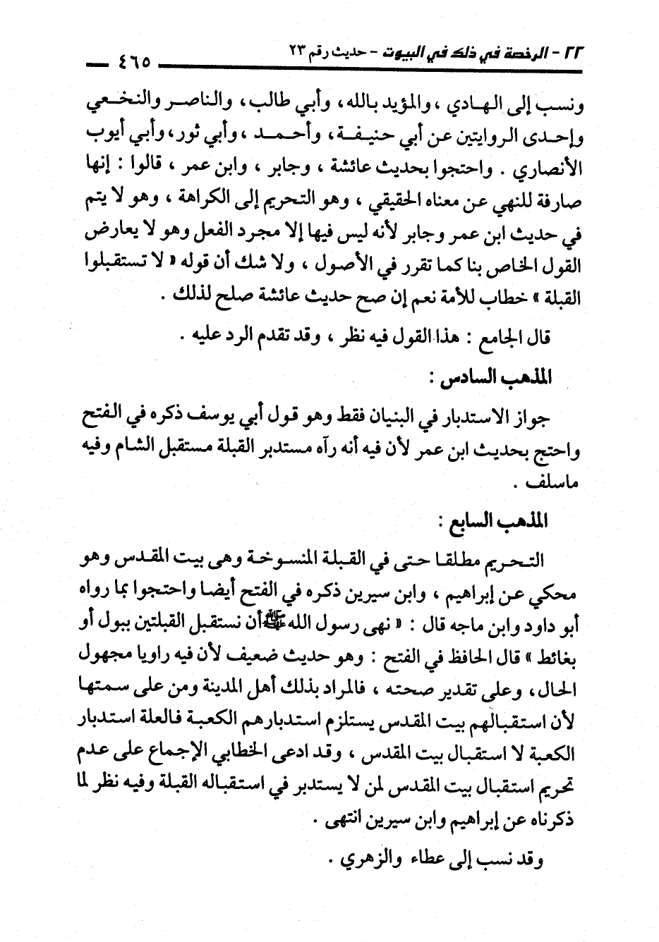 التحريم مطلقا حتى في القبلة المنسوخة وهي بيت المقدس وهو محكي عن إبراهيم، وابن سيرين ذكره في الفتح أيضا واحتجوا بما رواه أبو داود وابن ماجه قال: "نهى رسول الله - صلى الله عليه وسلم - أن نستقبل القبلتين ببول أو بغائط" قال الحافظ في الفتح: وهو حديث ضعيف لأن فيه راويا مجهول الحال، وعلى تقدير صحته، فالمراد بذلك أهل المدينة ومن على سمتها لأن استقبالهم بيت المقدس يستلزم استدبارهم الكعبة فالعلة استدبار الكعبة لا استقبال بيت المقدس، وقد ادعى الخطابي الإجماع على عدم تحريم استقبال بيت المقدس لمن لا يستدبر في استقباله القبلة وفيه نظر لما ذكرناه عن إبراهيم وابن سيرين انتهى.