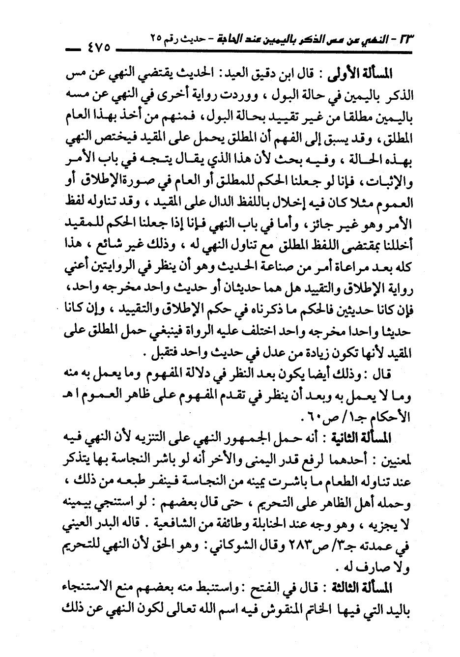 المسألة الأولى: قال ابن دقيق العيد: الحديث يقتضي النهي عن مس الذكر باليمين في حالة البول، ووردت رواية أخرى في النهي عن مسه باليمين مطلقا من غير تقييد بحالة البول، فمنهم من أخذ بهذا العام المطلق، وقد يسبق إلى الفهم أن المطلق يحمل على المقيد فيختص النهي بهذه الحالة، وفيه بحث لأن هذا الذي يقال يتجه في باب الأمر والإثبات، فإنا لو جعلنا الحكم للمطلق أو العام في صورة الإطلاق أو العموم مثلا كان فيه إخلال باللفظ الدال على المقيد، وقد تناوله لفظ الأمر وهو غير جائز، وأما في باب النص فإنا إذا جعلنا الحكم للمقيد أخللنا بمقتضى اللفظ المطلق مع تناول النهي له، وذلك غير شائع، هذا كله بعد مراعاة أمر من صناعة الحديث وهو أن ينظر في الروايتين أعني رواية الإطلاق والتقييد هل هما حديثان أو حديث واحد مخرجه واحد، فإن كانا حديثين فالحكم ما ذكرناه في حكم الإطلاق والتقييد، وإن كانا حديثا واحدا مخرجه واحد اختلف عليه الرواة فينبغي حمل المطلق على المقيد لأنها تكون زيادة من عدل في حديث واحد فتقبل.