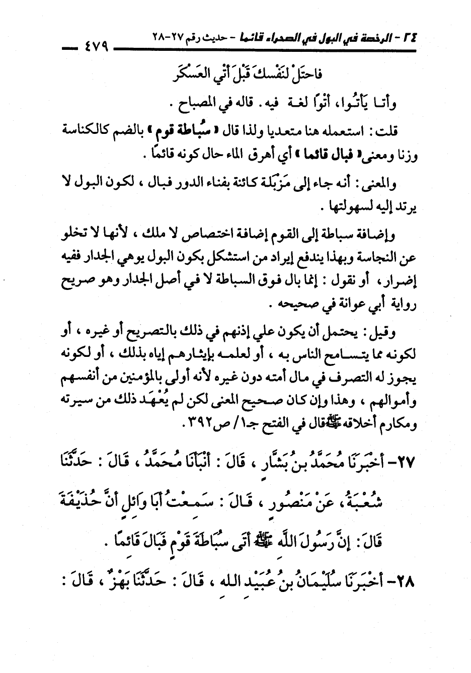27 - أَخْبَرَنَا مُحَمَّدُ بْنُ بَشَّارٍ، قَالَ: أَنْبَأَنَا مُحَمَّدٌ، قَالَ: حَدَّثَنَا شُعْبَةُ، عَنْ مَنْصُورٍ، قَالَ: سَمِعْتُ أَبَا وَائِلٍ أَنَّ حُذَيْفَةَ قَالَ: إِنَّ رَسُولَ اللهِ - صلى الله عليه وسلم - أَتَى سُبَاطَةَ قَوْمٍ فَبَالَ قَائِمًا.