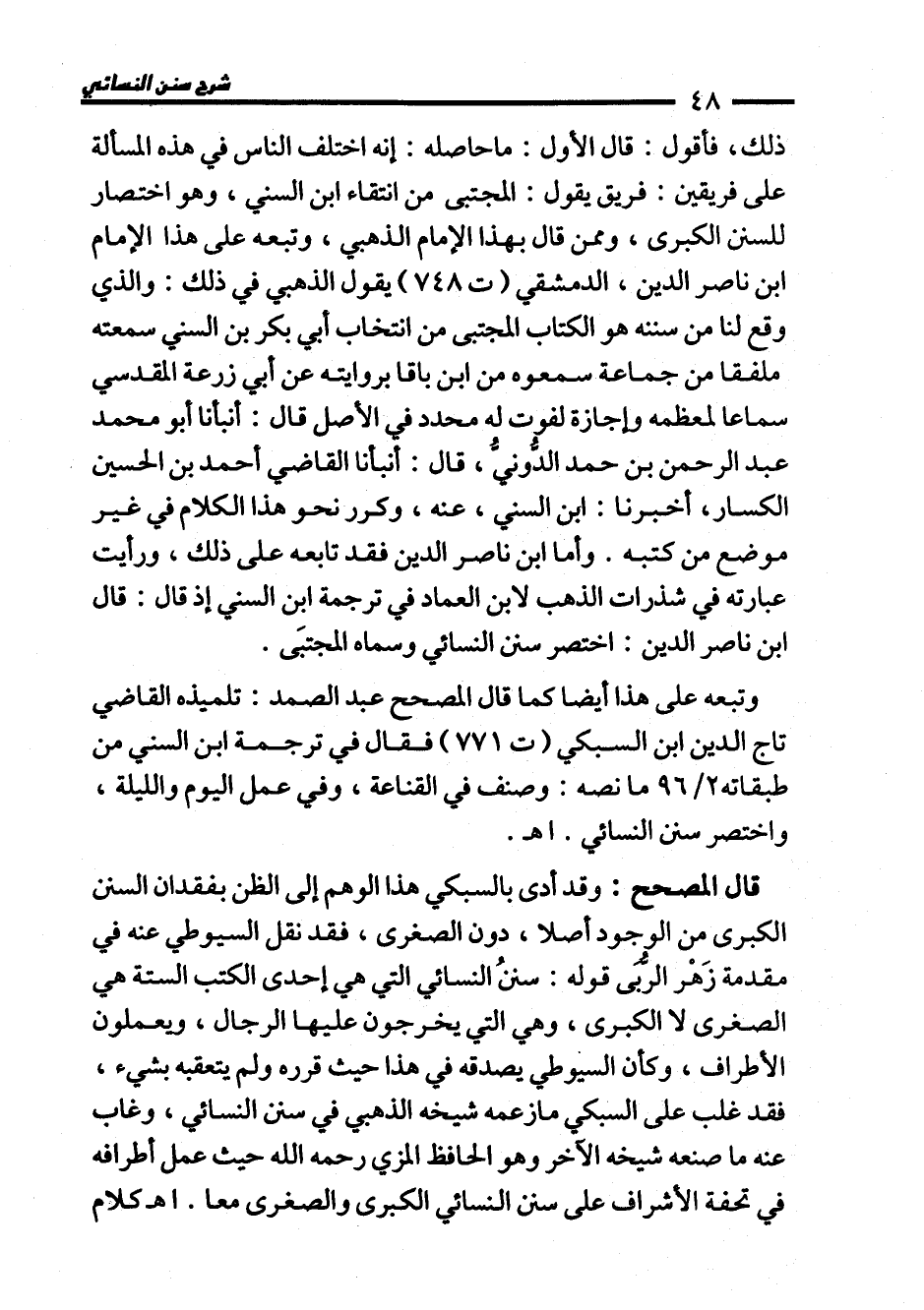 قال المصحح: وقد أدى بالسبكي هذا الوهم إلى الظن بفقدان السنن الكبرى من الوجود أصلًا، دون الصغرى، فقد نقل السيوطي عنه في مقدمة زَهْر الرُّبَى قوله: سنن النسائي التي هي إحدى الكتب الستة هي الصغرى لا الكبرى، وهي التي يخرجون عليها الرجال، ويعملون الأطراف، وكأن السيوطي يصدقه في هذا حيث قرره ولم يتعقبه بشيء، فقد غلب على السبكي ما زعمه شيخه الذهبي في سنن النسائي، وغاب عنه ما صنعه شيخه الآخر وهو الحافظ المزي رحمه الله حيث عمل أطرافه في تحفة الأشراف على سننن النسائي الكبرى والصغرى معا. اهـ كلام