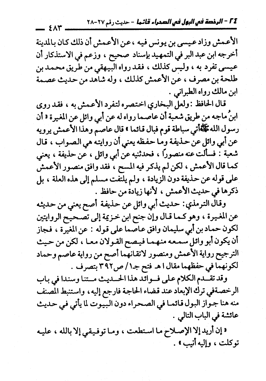 قال الحافظ: ولعل البخاري اختصره لتفرد الأعمش به، فقد روى ابنُ ماجه من طريق شعبة أن عاصما رواه له عن أبي وائل عن المغيرة "أن رسول الله - صلى الله عليه وسلم - أتى سباطة قوم فبال قائما" قال عاصم وهذا الأعمش يرويه عن أبي وائل عن حذيفة وما حفظه يعني أن روايته هي الصواب، قال شعبة: فسألت عنه منصورًا، فحدثنيه عن أبي وائل، عن حذيفة، يعني كما قال الأعمش، لكن لم يذكر فيه المسح، فقد وافق منصور الأعمش على قوله عن حذيفة دون الزيادة، ولم يلتفت مسلم إلى هذه العلة، بل ذكرها في حديث الأعمش؛ لأنها زيادة من حافظ.