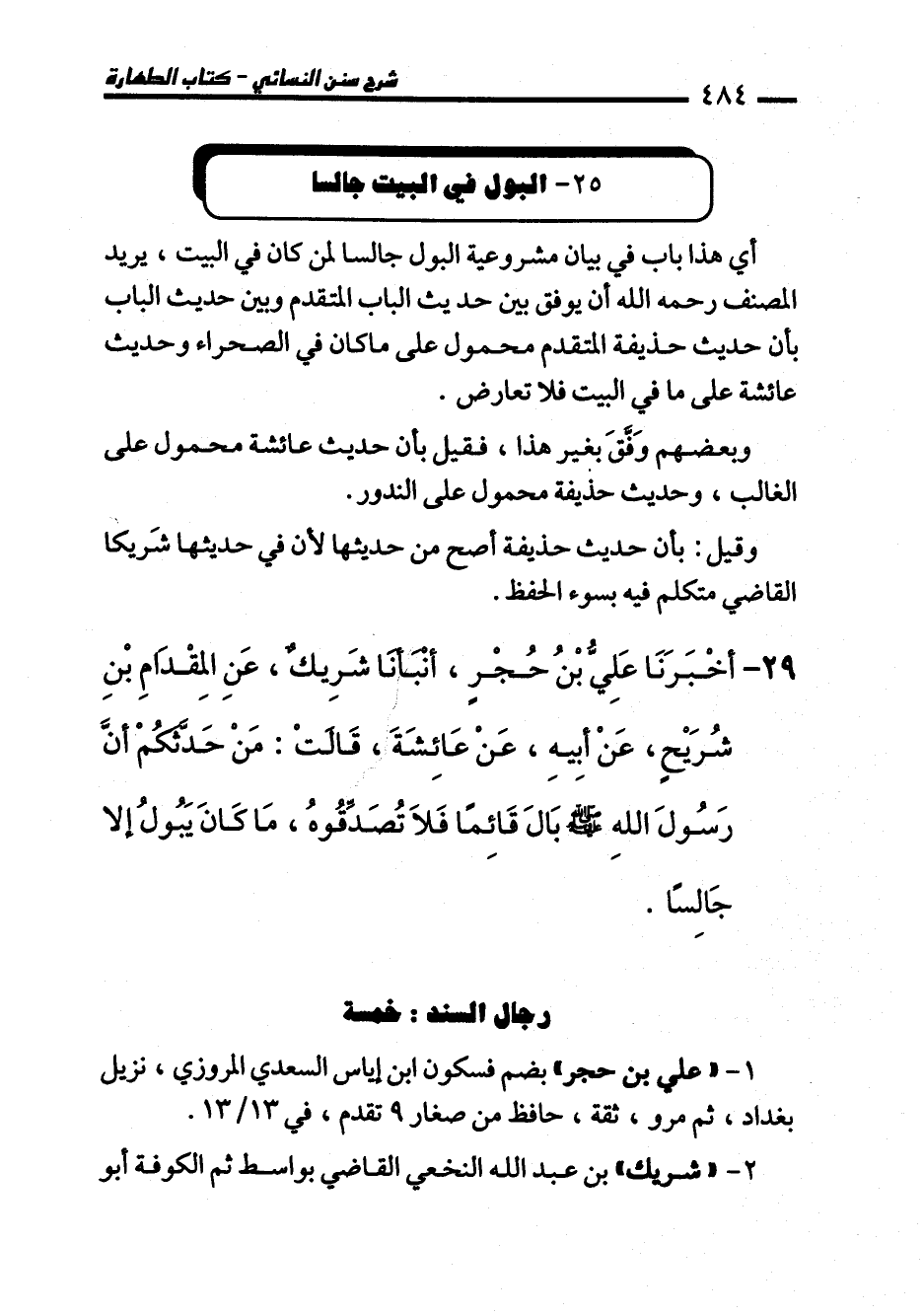 29 - أَخْبَرَنَا عَلِيُّ بْنُ حُجْرٍ، أَنْبَأَنَا شَرِيكٌ، عَنِ الْمِقْدَامِ بْنِ شُرَيْحٍ، عَنْ أَبِيهِ، عَنْ عَائِشَةَ، قَالَتْ: مَنْ حَدَّثَكُمْ أَنَّ رَسُولَ اللهِ - صلى الله عليه وسلم - بَالَ قَائِمًا فَلاَ تُصَدِّقُوهُ، مَا كَانَ يَبُولُ إِلاَّ جَالِسًا.