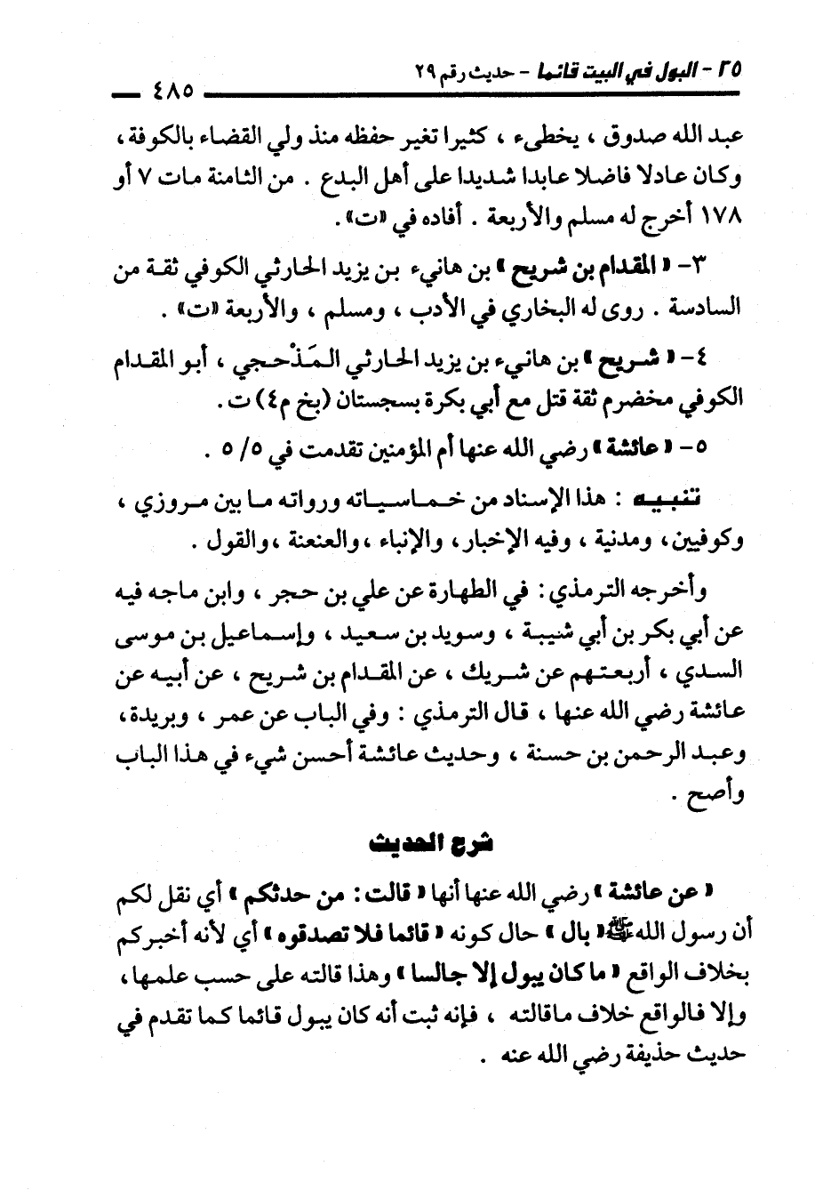 "عن عائشة" رضي الله عنها أنها "قالت: من حدثكم" أي نقل لكم أن رسول الله - صلى الله عليه وسلم - "بال" حال كونه "قائما فلا تصدقوه" أي لأنه أخبركم بخلاف الواقع "ما كان يبول إلا جالسا" وهذا قالته على حسب علمها، وإلا فالواقع خلاف ما قالته، فإنه ثبت أنه كان يبول قائما كما تقدم في حديث حذيفة رضي الله عنه.