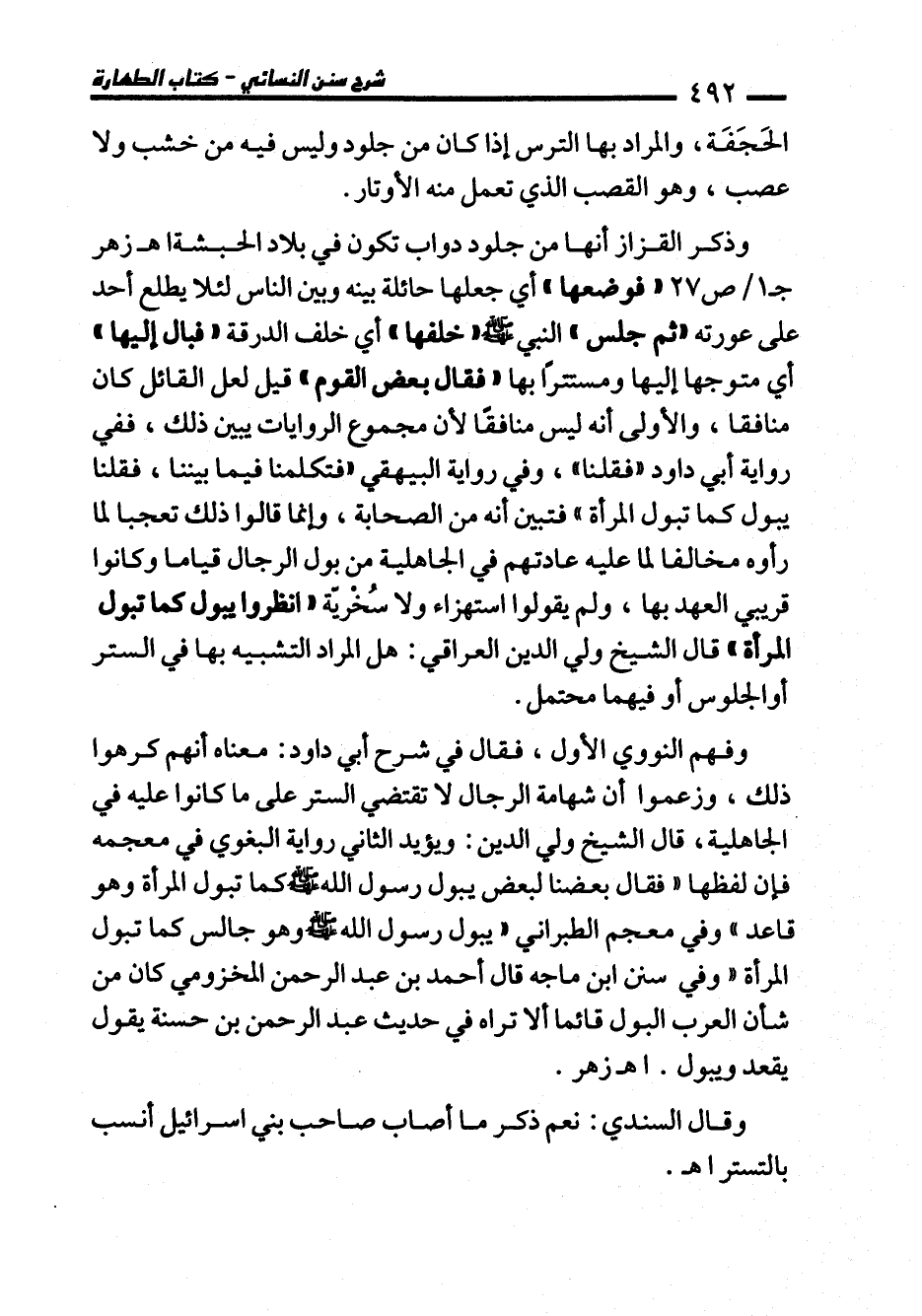 وفهم النووي الأول، فقال في شرح أبي داود: معناه أنهم كرهوا ذلك، وزعموا أن شهامة الرجال لا تقتضي الستر على ما كانوا عليه في الجاهلية، قال الشيخ ولي الدين: ويؤيد الثاني رواية البغوي في معجمه فإن لفظها "فقال بعضنا لبعض يبول رسول الله - صلى الله عليه وسلم - كما تبول المرأة وهو قاعد" وفي معجم الطبراني "يبول رسول الله - صلى الله عليه وسلم - وهو جالس كما تبول المرأة" وفي سنن ابن ماجه قال أحمد بن عبد الرحمن المخزومي كان من شأن العرب البول قائمًا ألا تراه في حديث عبد الرحمن بن حسنة يقول يقعد ويبول. اهـ زهر.