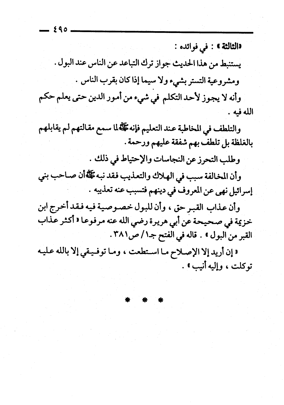 وأن عذاب القبر حق، وأن للبول خصوصية فيه فقد أخرج ابن خزيمة في صحيحة عن أبي هريرة رضي الله عنه مرفوعا "أكثر عذاب القبر من البول". قاله في الفتح جـ 1/ ص 381.