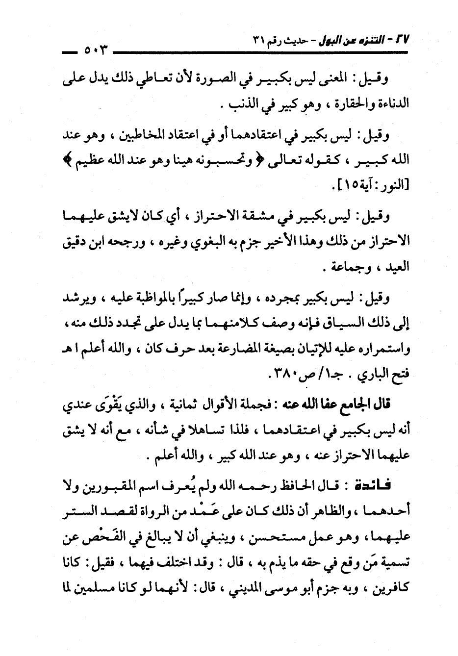 وقيل: ليس بكبير بمجرده، وإنما صار كبيرًا بالمواظبة عليه، ويرشد إلى ذلك السياق فإنه وصف كلا منهما بما يدل على تجدد ذلك منه، واستمراره عليه للإتيان بصيغة المضارعة بعد حرف كان، والله أعلم اهـ فتح الباري. جـ 1/ ص380.