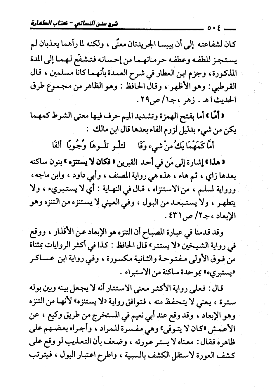 قال: فعلى رواية أكثر معنى الاستتار أنه لا يجعل بينه وبين بوله سترة، يعني لا يتحفظ منه، فتوافق رواية "لا يستنزه" لأنها من التنزه وهو الإبعاد، وقد وقع عند أبي نعيم في المستخرج من طريق وكيع، عن الأعمش "كان لا يتوقى" وهي مفسرة للمراد، وأجراه بعضهم على ظاهره فقال: معناه لا يستر عورته، وضعف بأن التعذيب لو وقع على كشف العورة لاستقل الكشف بالسبية، واطرح اعتبار البول، فيترتب