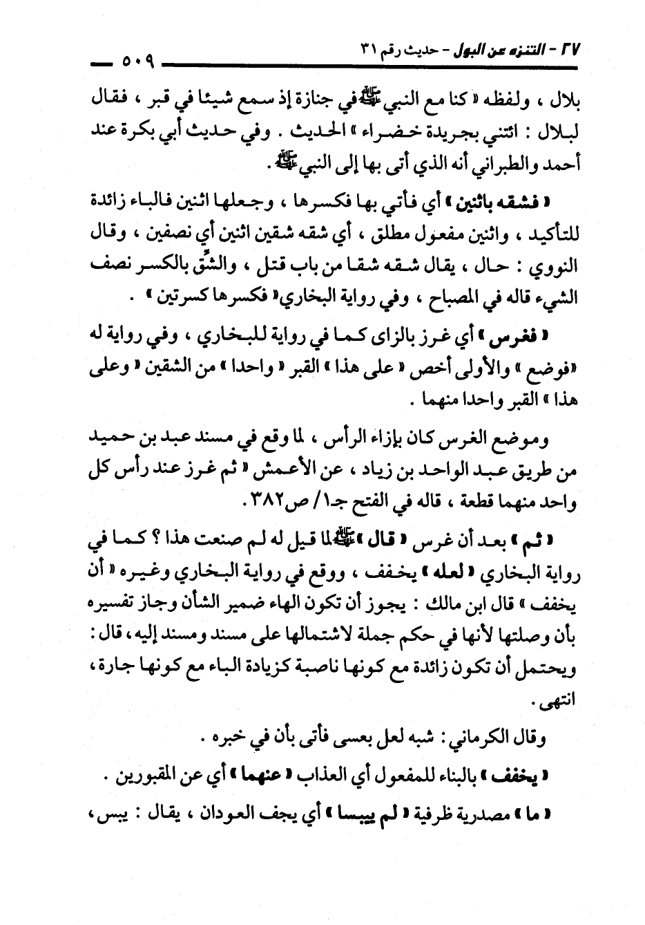 "ثم" بعد أن غرس "قال" - صلى الله عليه وسلم - لما قيل له لم صنعت هذا؟ كما في رواية البخاري "لعله" يخفف، ووقع في رواية البخاري وغيره "أن يخفف" قال ابن مالك: يجوز أن تكون الهاء ضمير الشأن وجاز تفسيره بأن وصلتها لأنها في حكم جملة لاشتمالها على مسند ومسند إليه، قال: ويحتمل أن تكون زائدة مع كونها ناصبة كزيادة الباء مع كونها جارة، انتهى.