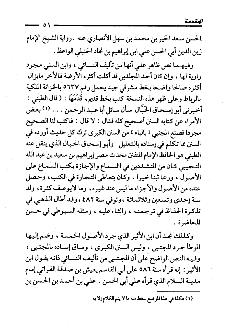 وفيهما نص ظاهر علي أنها من تأليف النسائي، وابن السني مجرد راوية لها، وإن كان أحد المجلدين قد أكلت أكثره الأرضة فالأخر ما يزال أكثره صالحا واضحًا بخط مشرقي جيد يحمل رقم 5637 بالخزانة الملكية بالرباط وعلى ظهر هذه النسخة كتب بخط قديم، قَدُمَهَا: (قال الطبني: أخبرنى أبو إسحاق الحَبَّال سأل سائل أبا عبد الرحمن ... (¬1) بعض الأمراء عن كتابه السنن أصحيح كله فقال: لا قال: فاكتب لنا الصحيح مجردا فصنع المجتبي "بالباء" من السنن الكبرى ترك كل حديث أورده في السنن مما تكلم في إسناده بالتعليل وأبو إسحاق الحبال الذي ينقل عنه الطبني هو الحافظ الإمام المتفنن محدث مصر إبراهيم بن سعيد بن عبد الله التجيبي كان من المتشددين في السماع والإجازة يكتب السماع على الأصول، ورعا ثبتا خيرا، وكان يتعاطى التجارة في الكتب، وحصل عنده من الأصول والأجزاء ما ليس عند غيره، وما لايوصف كثرة، ولد سنة إحدى وتسعين وثلاثمائة، وتوفي سنة 482، وقد أطال الذهبي في تذكرة الحفاظ في ترجمته، والثناء عليه، ومثله السيوطي في حسن المحاضرة.