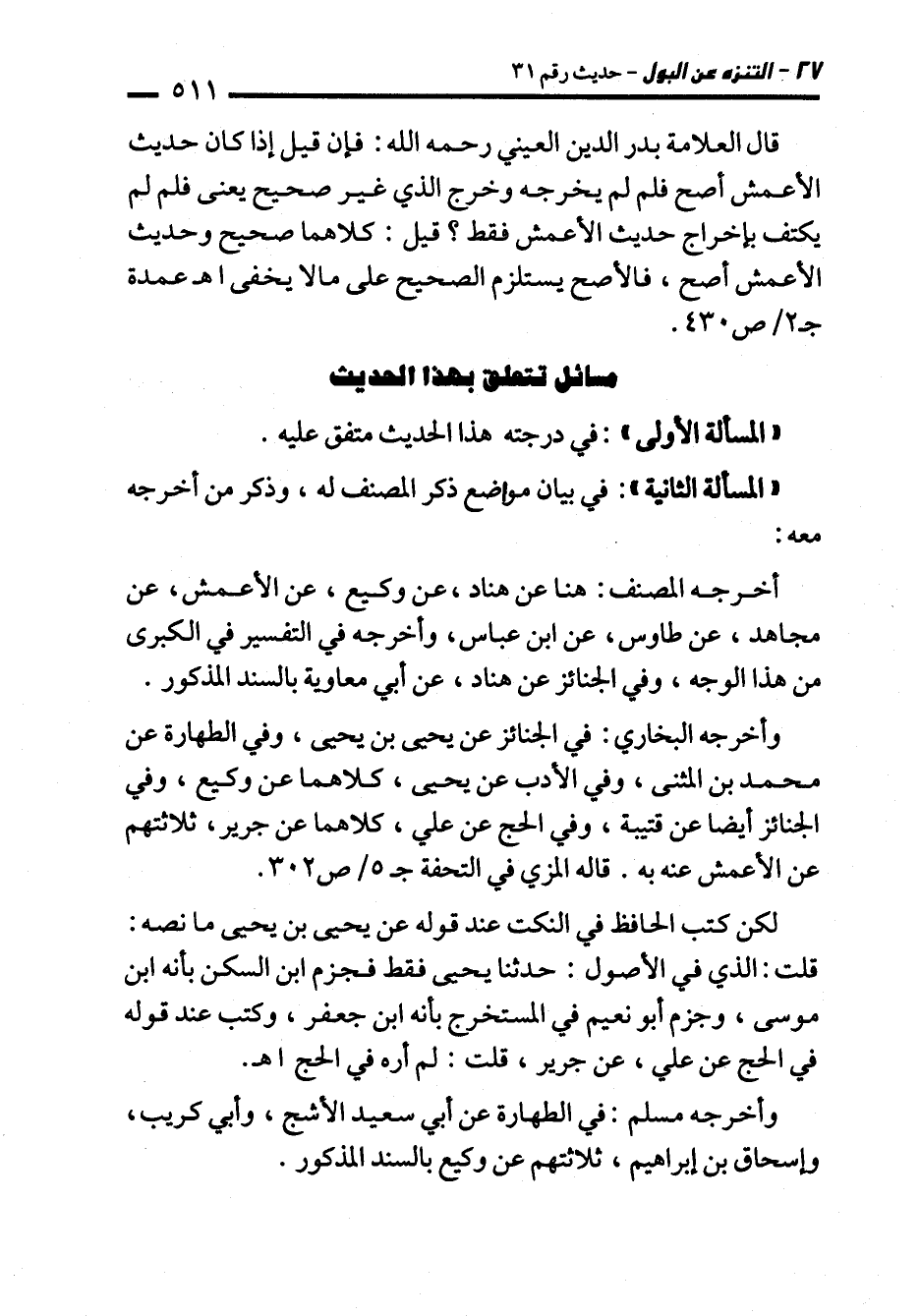 وأخرجه البخاري: في الجنائز عن يحيى بن يحيى، وفي الطهارة عن محمَّد بن المثنى، وفي الأدب عن يحيى، كلاهما عن وكيع، وفي الجنائز أيضا عن قتيبة، وفي الحج عن علي، كلاهما عن جرير، ثلاثتهم عن الأعمش عنه به. قاله المزي في التحفة ج 5/ ص 302.
