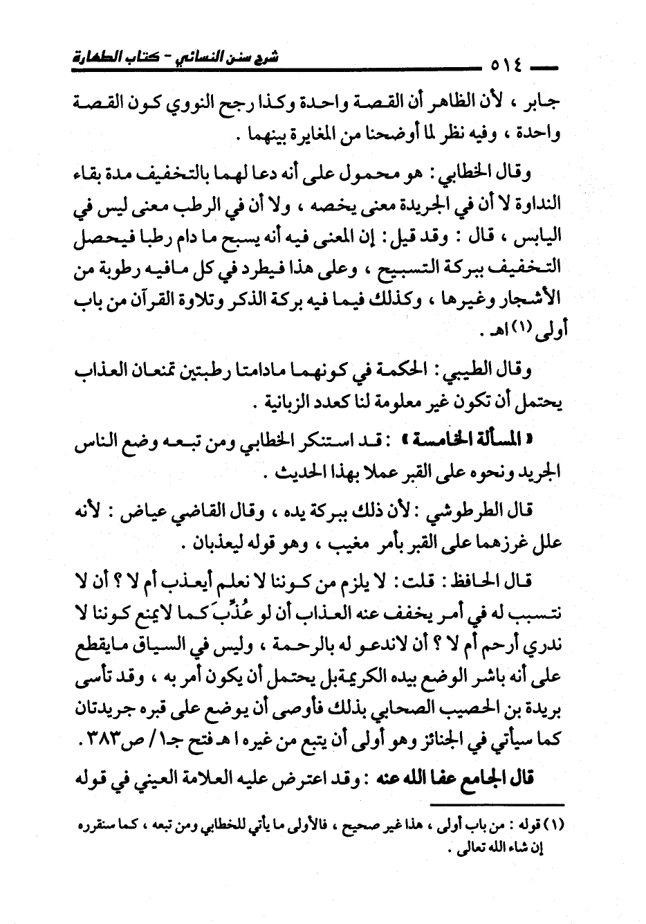 "المسألة الخامسة": قد استنكر الخطابي ومن تبعه وضع الناس الجريد ونحوه على القبر عملا بهذا الحديث.