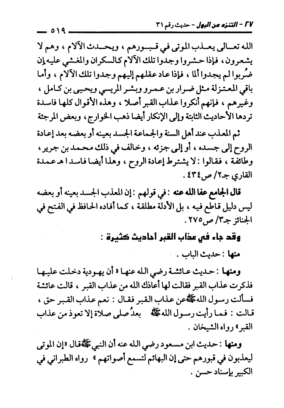 قال الجامع عفا الله عنه: في قولهم: إن المعذب الجسد بعينه أو بعضه ليس دليل قاطع فيه، بل الأدلة مطلقة، كلما أفاده الحافظ في الفتح في الجنائز جـ 3/ ص 275.