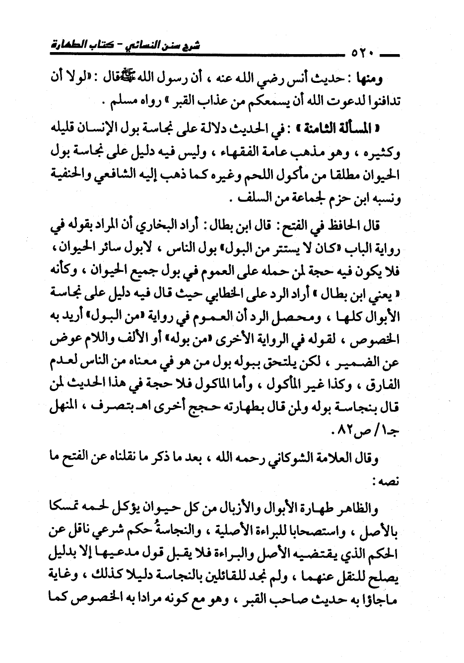 والظاهر طهارة الأبوال والأزبال من كل حيوان يؤكل لحمه تمسكا بالأصل، واستصحابا للبراءة الأصلية، والنجاسةُ حكم شرعي ناقل عن الحكم الذي يقتضيه الأصل والبراءة فلا يقبل قول مدعيها إلا بدليل يصلح للنقل عنهما، ولم نجد للقائلين بالنجاسة دليلا كذلك، وغاية ما جاؤا به حديث صاحب القبر، وهو مع كونه مرادا به الخصوص كما
