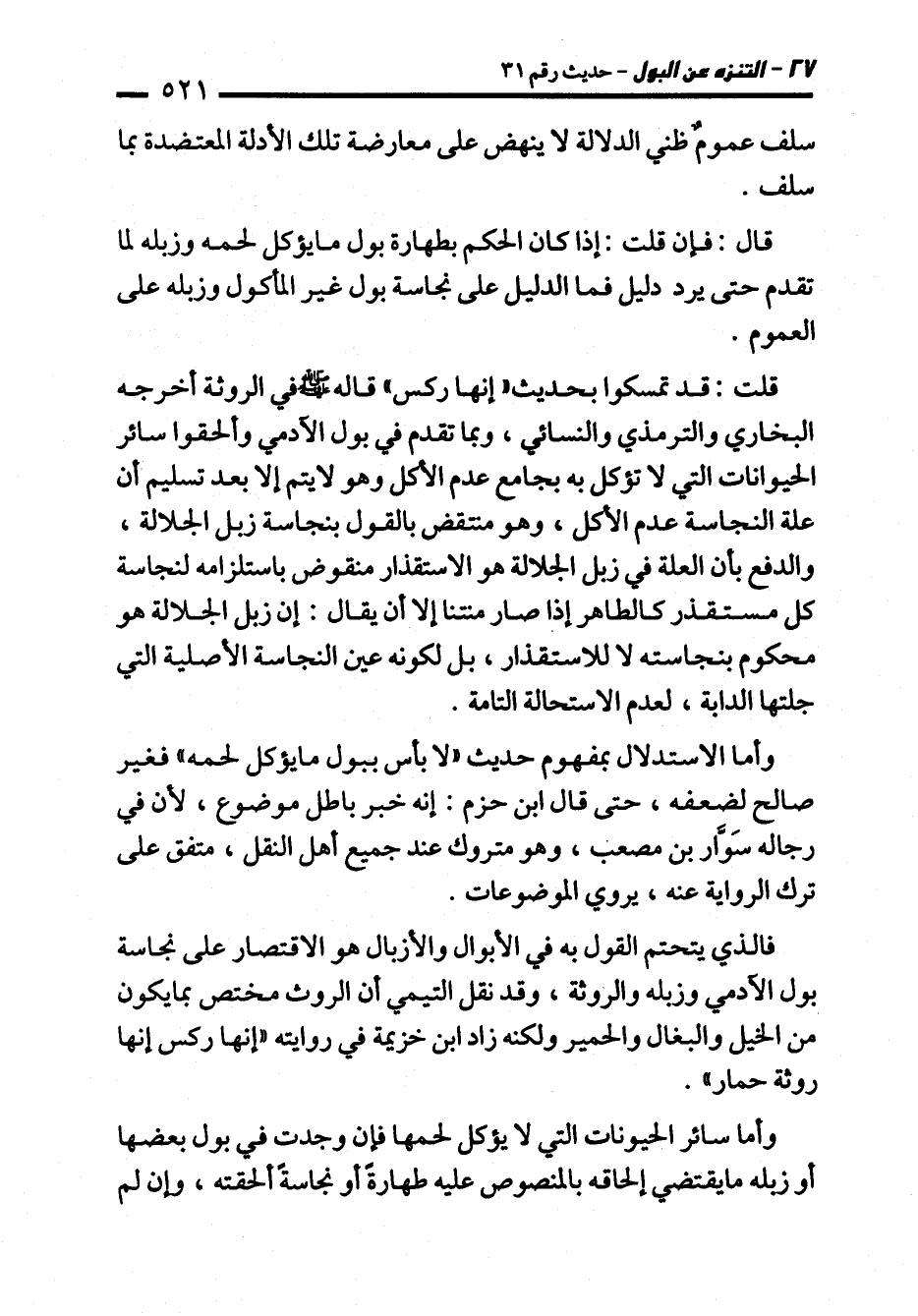 فالذي يتحتم القول به في الأبوال والأزبال هو الاقتصار على نجاسة بول الآدمي وزبله والروثة، وقد نقل التيمي أن الروث مختص بما يكون من الخيل والبغال والحمير ولكنه زاد ابن خزيمة في روايته "إنها ركس إنها روثة حمار".