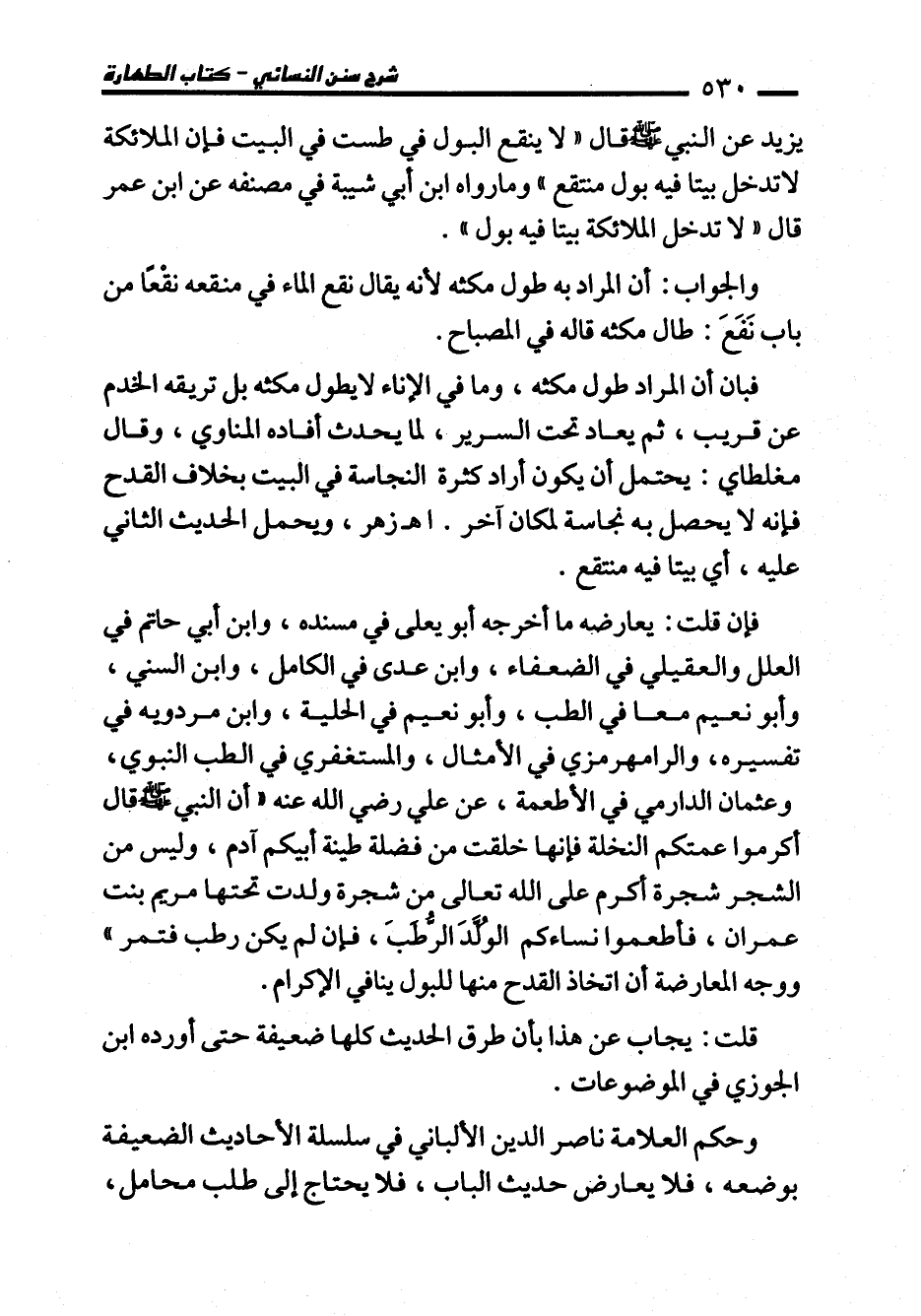 يزيد عن النبي - صلى الله عليه وسلم - قال "لا ينقع البول في طست في البيت فإن الملائكة لا تدخل بيتا فيه بول منتقع" وما رواه ابن أبي شيبة في مصنفه عن ابن عمر قال "لا تدخل الملائكة بيتا فيه بول".