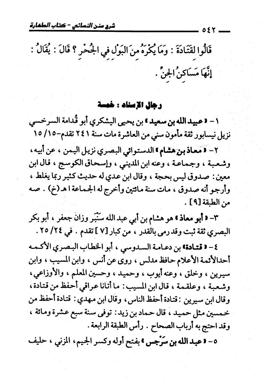 قَالُوا لِقَتَادَةَ: وَمَا يُكْرَهُ مِنَ الْبَوْلِ فِي الْجُحْرِ؟ قَالَ: يُقَالُ: إِنَّهَا مَسَاكِنُ الْجِنِّ.