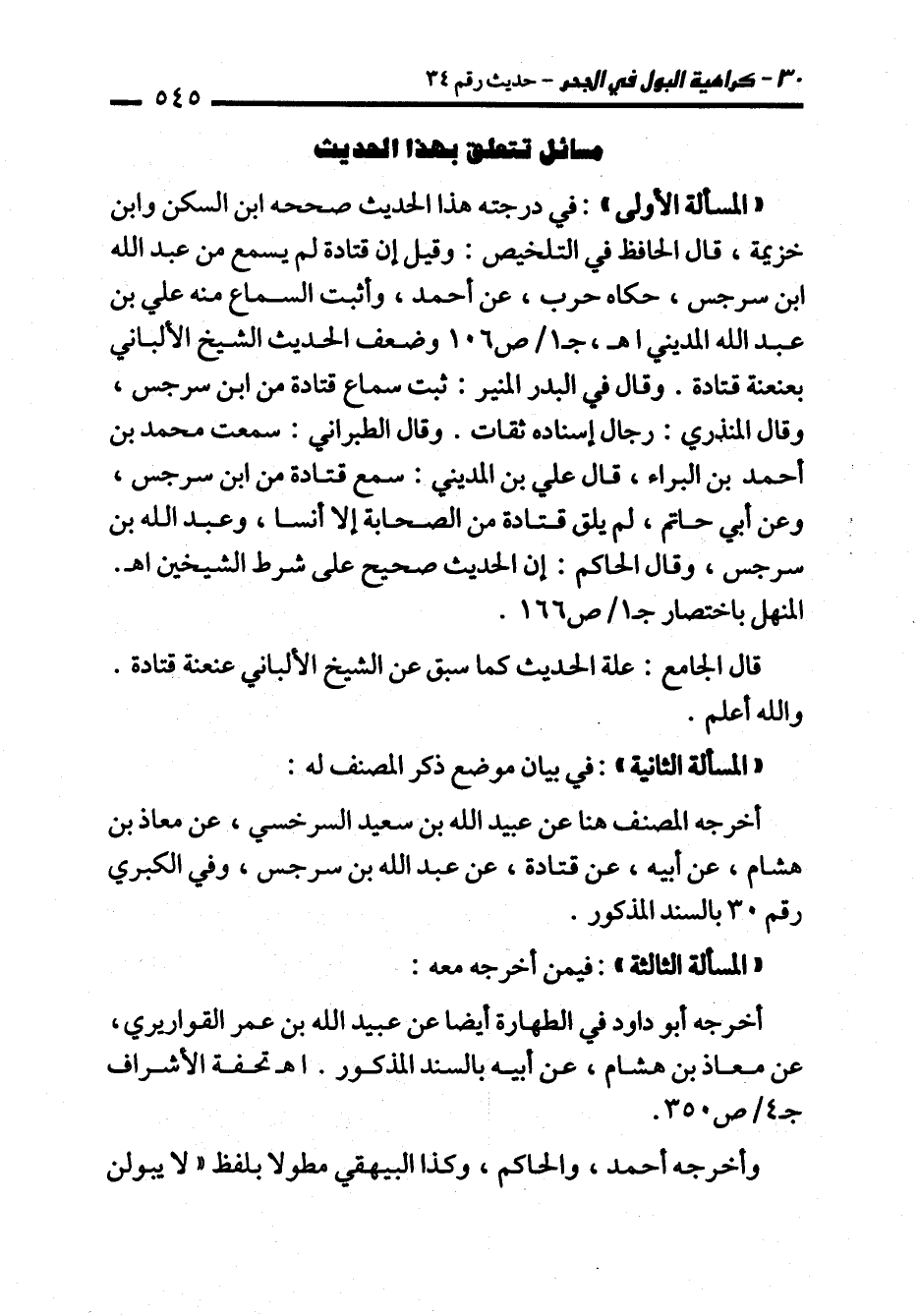 "المسألة الأولى": في درجته هذا الحديث صححه ابن السكن وابن خزيمة، قال الحافظ في التلخيص: وقيل إن قتادة لم يسمع من عبد الله ابن سرجس، حكاه حرب، عن أحمد، وأثبت السماع منه علي بن عبد الله المديني اهـ، جـ 1/ ص 106 وضعف الحديث الشيخ الألباني بعنعنة قتادة. وقال في البدر المنير: ثبت سماع قتادة من ابن سرجس، وقال المنذري: رجال إسناده ثقات. وقال الطبراني: سمعت محمَّد بن أحمد بن البراء، قال علي بن المديني: سمع قتادة من ابن سرجس، وعن أبي حاتم، لم يلق قتادة من الصحابة إلا أنسا، وعبدُ الله بن سرجس، وقال الحاكم: إن الحديث صحيح على شرط الشيخين اهـ. المنهل باختصار جـ 1/ ص 166.