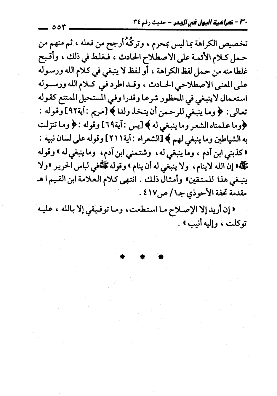 تخصيص الكراهة بما ليس بمحرم، وتركُهُ أرجح من فعله، ثم منهم من حمل كلام الأئمة على الاصطلاح الحادث، فغلط في ذلك، وأقبح غلطا منه من حمل لفظ الكراهة، أو لفظ ينبغي في كلام الله ورسوله على المعنى الاصطلاحي الحادث، وقد اطرد في كلام الله ورسوله استعمال لا ينبغي في المحظور شرعا وقدرا وفي المستحيل الممتنع كقوله تعالى: {وَمَا يَنْبَغِي لِلرَّحْمَنِ أَنْ يَتَّخِذَ وَلَدًا} [مريم: آية 92] وقوله: {وَمَا عَلَّمْنَاهُ الشِّعْرَ وَمَا يَنْبَغِي لَهُ} [يس: آية 69] وقوله: {وَمَا تَنَزَّلَتْ بِهِ الشَّيَاطِينُ (210) وَمَا يَنْبَغِي لَهُمْ وَمَا يَسْتَطِيعُونَ} [الشعراء: آية 210، 211]} وقوله على لسان نبيه: "كذبني ابن آدم، وما ينبغي له، وشتمني ابن آدم، وما ينبغي له" وقوله - صلى الله عليه وسلم - "إن الله لا ينام، ولا ينبغي له أن ينام" وقوله - صلى الله عليه وسلم - في لباس الحرير "ولا ينبغي هذا للمتقين" وأمثال ذلك. انتهى كلام العلامة ابن القيم اهـ مقدمة تحفة الأحوذي جـ 1/ ص 417.