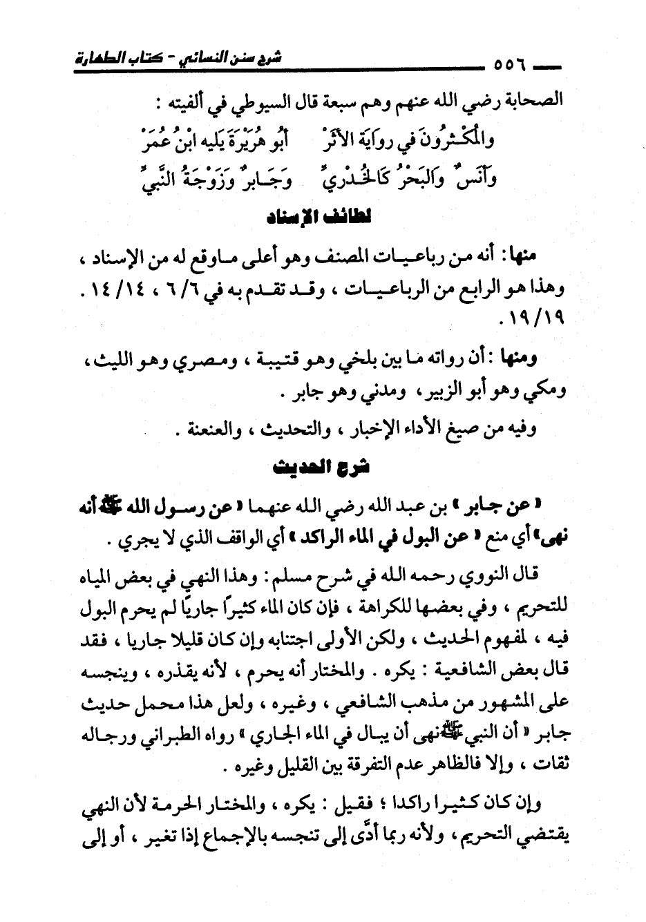 "عن جابر" بن عبد الله رضي الله عنهما "عن رسول الله - صلى الله عليه وسلم - أنه نهى" أي منع "عن البول في الماء الراكد" أي الواقف الذي لا يجري.
