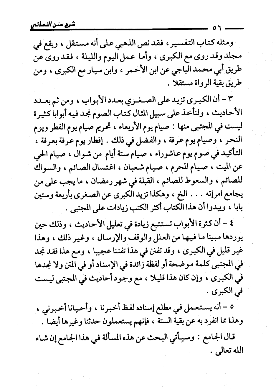 3 - أن الكبرى تزيد على الصغري بعدد الأبواب، ومن ثم بعدد الأحاديث، ولنأخذ على سبيل المثال كتاب الصوم نجد فيه أبوابا كثيرة ليست في المجتبى منها: صيام يوم الأربعاء، تحريم صيام يوم الفطر ويوم النحر، وصيام يوم عرفة، والفضل في ذلك. إفطار يوم عرفة بعرفة، التأكيد في صوم يوم عاشوراء، صيام ستة أيام من شوال، صيام الحي عن الميت، صيام المحرم، صيام شعبان، اغتسال الصائم، والسواك للصائم، والسعوط للصائم، القبلة في شهر رمضان، ما يجب على من يجامع امرأته ... الخ، وهكذا تزيد الكبرى عن الصغرى بأربعة وستين بابا، ويبدوا أن هذا الكتاب أكثر الكتب زيادات على المجتبى.