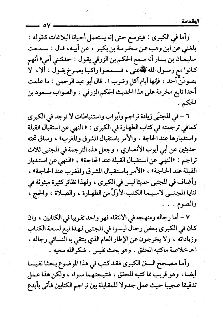 7 - أما رجاله ومنهجه في الانتقاء فهو واحد تقريبا في الكتابين، وإن كان في الكبرى بعض رجال ليسوا في المجتبى فهذا تبع لسعة الكتاب وزياداته، ولا يخرجون عن الإطار العام الذي ينتقي به النسائي رجاله، اهـ خلاصة ما كتبه المحقق. وهو بحث نفيس. شكر الله سعيه.