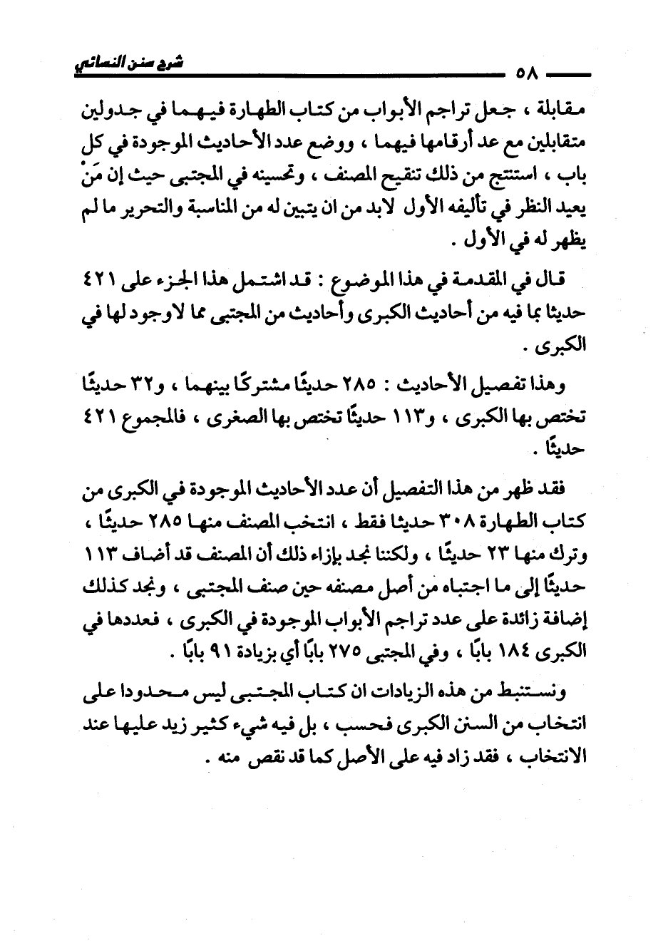 فقد ظهر من هذا التفصيل أن عدد الأحاديث الموجودة في الكبرى من كتاب الطهارة 308 حديثا فقط، انتخب المصنف منها 285 حديثًا، وترك منها 23 حديثًا، ولكننا نجد بإزاء ذلك أن المصنف قد أضاف 113 حديثًا إلى ما اجتباه من أصل مصنفه حين صنف المجتبى، ونجد كذلك إضافة زائدة على عدد تراجم الأبواب الموجودة في الكبرى، فعددها في الكبرى 184 بابًا، وفي المجتبى 275 بابًا أي بزيادة 91 بابًا.