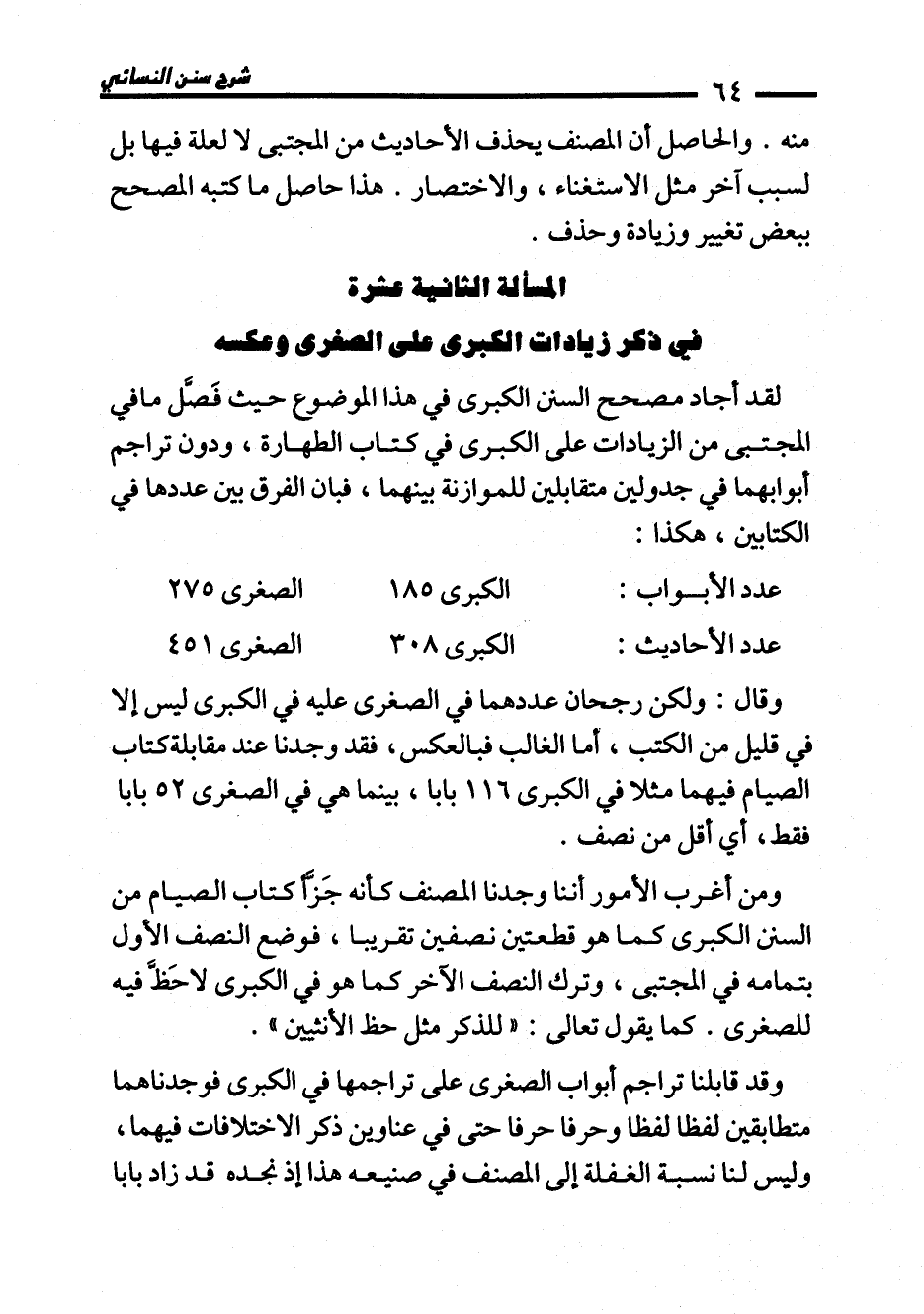 وقال: ولكن رجحان عددهما في الصغرى عليه في الكبرى ليس إلا في قليل من الكتب، أما الغالب فبالعكس، فقد وجدنا عند مقابلة كتاب الصيام فيهما مثلا في الكبرى 116 بابا، بينما هي في الصغرى 52 بابا فقط، أي أقل من نصف.