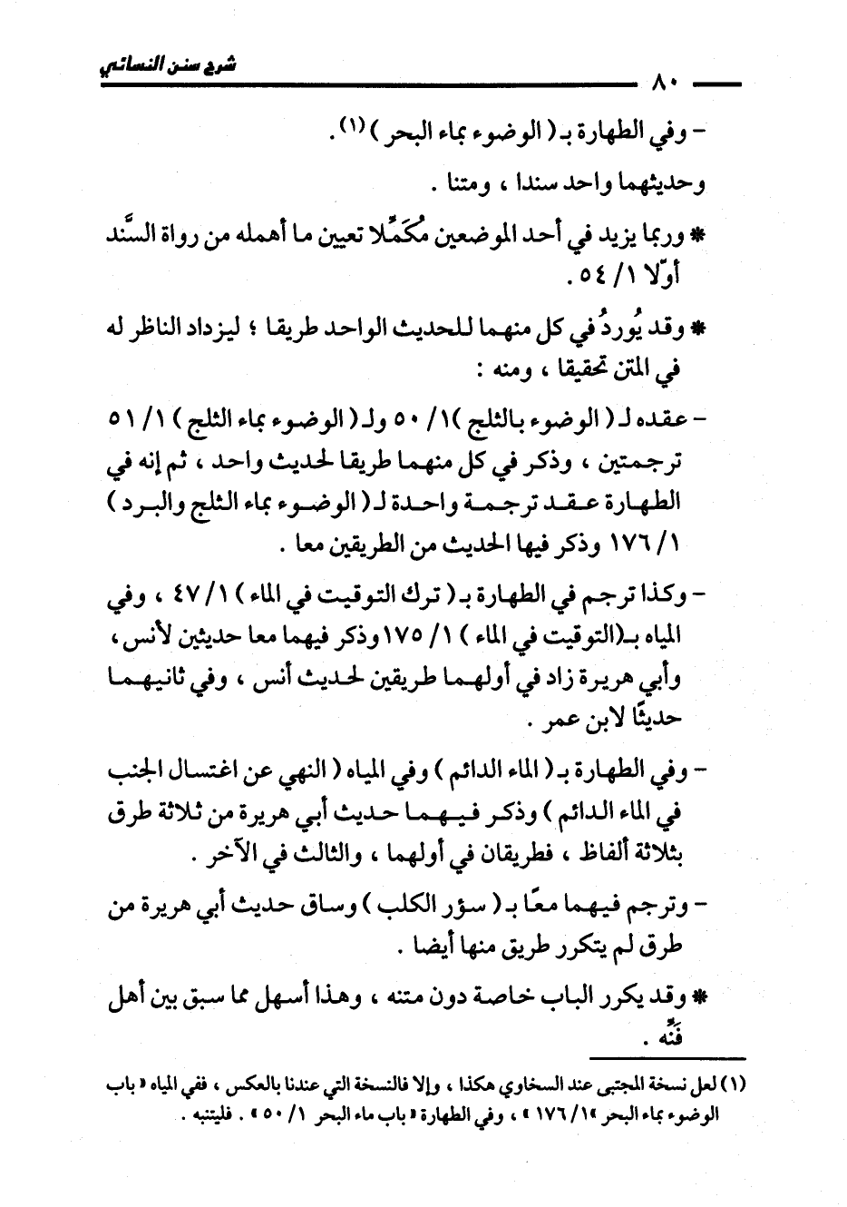 (¬1) لعل نسخة المجتبى عند السخاوي هكذا، وإلا فالنسخة التي عندنا بالعكس، ففي المياه "باب الوضوء بماء البحر" 1/ 176"، وفي الطهارة "باب ماء البحر 1/ 50". فليتنبه.