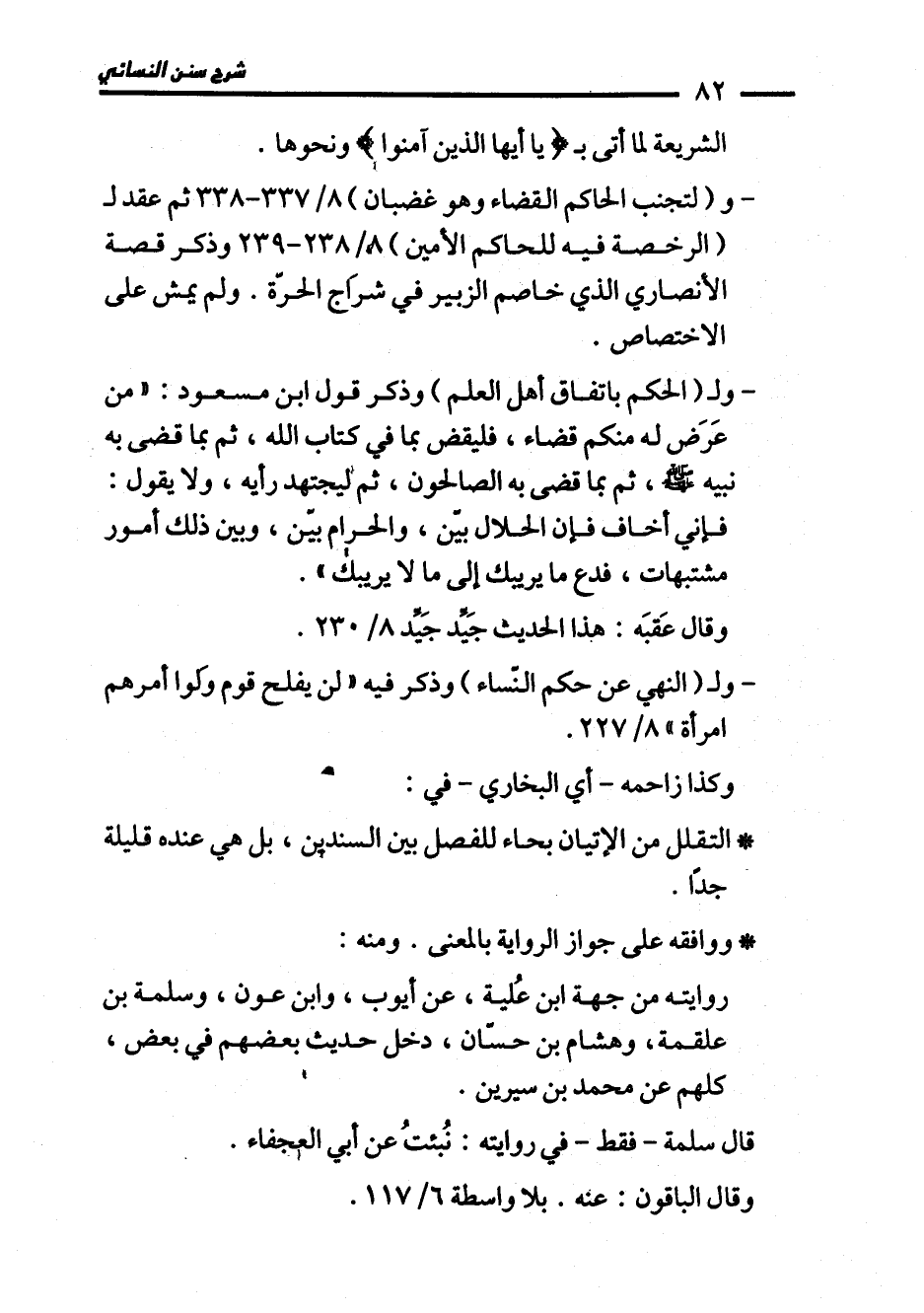 - ولـ (الحكم باتفاق أهل العلم) وذكر قول ابن مسعود: "من عَرَض له منكم قضاء، فليقض بما في كتاب الله، ثم بما قضى به نبيه - صلى الله عليه وسلم -، ثم بما قضى به الصالحون، ثم ليجتهد رأيه، ولا يقول: فإني أخاف فإن الحلال بيّن، والحرام بيَّن، وبين ذلك أمور مشتبهات، فدع ما يريبك إلى ما لا يريبك".