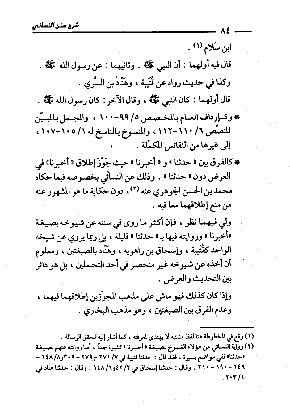 (¬2) رواية النسائي عن هؤلاء الشيوخ بصيغة "أخبرنا" كثيرة جدًا، أما روايته عنهم بصيغة "حدثنا" ففي مواضع يسيرة، فقد قال: حدثنا قتيبة في 7/ 271 - 279 - 309 و 8/ 148 - 149 - 190 - 210. وقال: حدثنا إسحاق في 2/ 42 و 6/ 148. وقال: حدثنا هناد في 1/ 203.