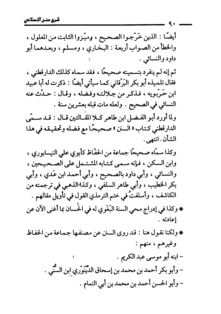وكذا سمّاه صحيحًا جماعة من الحفّاظ كأبوي علي النيسابوري، وابن السكن، فإنه سمى كتابه المشتمل على الصحيحين، والنسائي، وأبي داود بالصحيح، وأبي أحمد ابن عَدي، وأبي بكر الخطيب، وأبي طاهر السلفي، وكذا الذهبي في ترجمته من الكاشف، وأسلفتُ في ختم الترمذي القول في تأويل مقالهم.