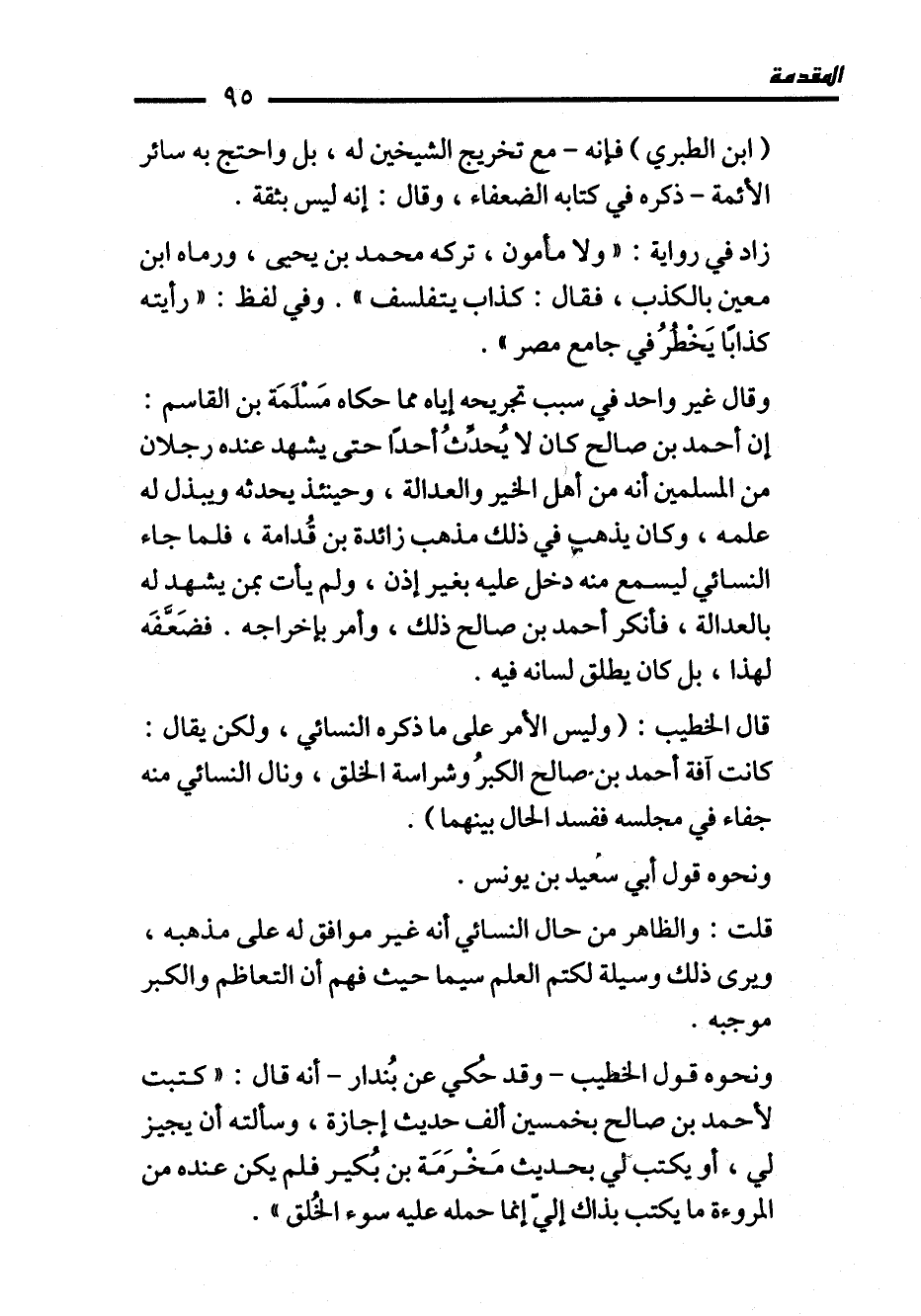 قال الخطيب: (وليس الأمر على ما ذكره النسائي، ولكن يقال: كانت آفة أحمد بن صالح الكبرُ وشراسة الخلق، ونال النسائي منه جفاء في مجلسه ففسد الحال بينهما).