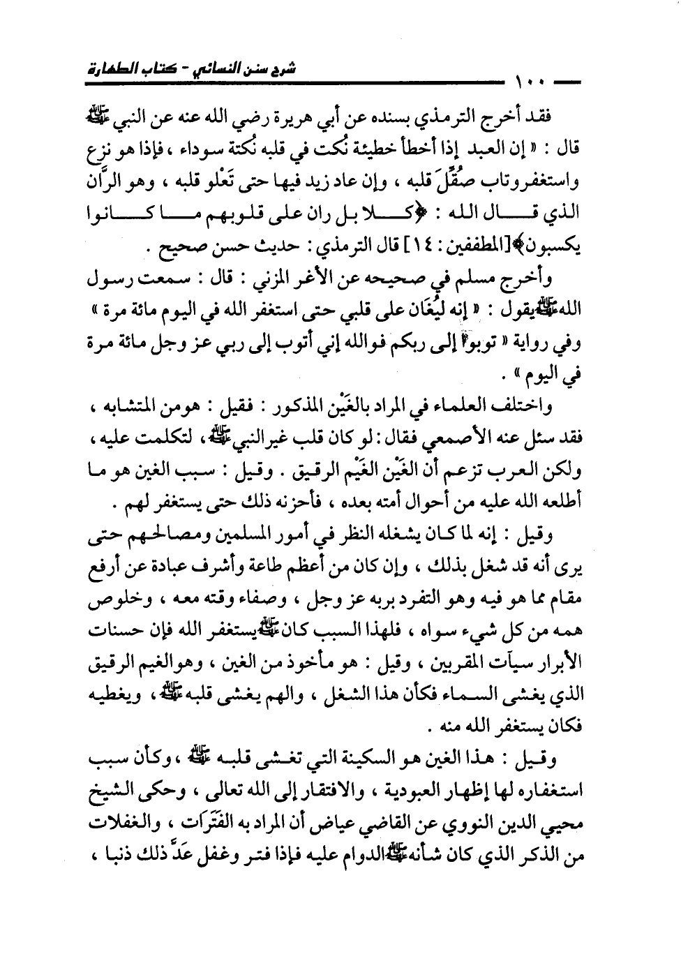 وقيل: هذا الغين هو السكينة التي تغشى قلبه - صلى الله عليه وسلم -، وكأن سبب استغفاره لها إظهار العبودية، والافتقار إلى الله تعالى، وحكى الشيخ محيي الدين النووي عن القاضي عباض أن المراد به الفَتَرَات، والغفلات من الذكر الذي كان شأنه - صلى الله عليه وسلم - الدوام عليه فإذا فتر وغفل عَدَّ ذلك ذنبا،