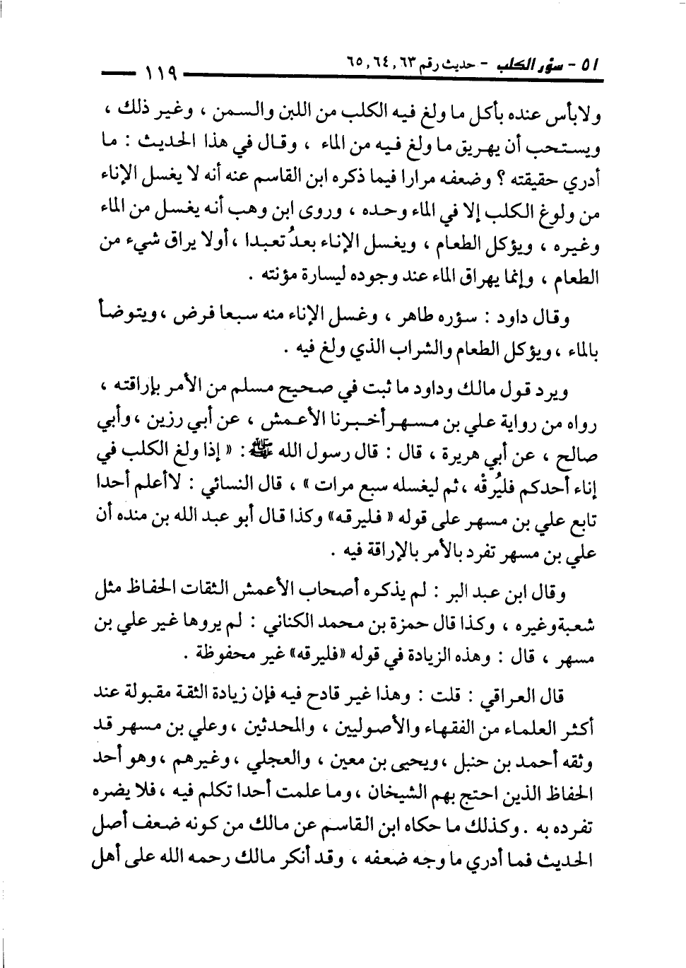 وقال ابن عبد البر: لم يذكره أصحاب الأعمش الثقات الحفاظ مثل شعبة وغيره، وكذا قال حمزة بن محمَّد الكناني: لم يروها غير علي بن مسهر، قال: وهذه الزيادة في قوله "فليرقه" غير محفوظة.