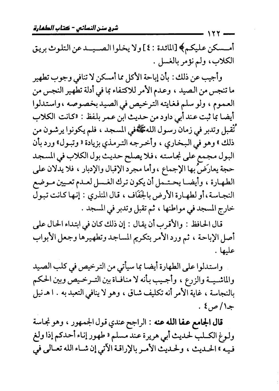 وأجيب عن ذلك: بأن إباحة الأكل مما أمسكن لا تنافي وجوب تطهير ما تنجس من الصيد، وعدم الأمر للاكتفاء بما في أدلة تطهير النجس من العموم، ولو سلم فغايته الترخيص في الصيد بخصوصه، واستدلوا أيضا بما ثبت عند أبي داود من حديث ابن عمر بلفظ: "كانت الكلاب تُقْبل وتدبر في زمان رسول الله - صلى الله عليه وسلم - في المسجد، فلم يكونوا يرشون من ذلك" وهو في البخاري، وأخرجه الترمذي بزيادة "وتبول" ورد بأن البول مجمع على نجاسته، فلا يصلح حديث بول الكلاب في المسجد حجة يعارَضُ بها الإجماع، وأما مجرد الإقبال والإدبار، فلا يدلان على الطهارة، وأيضا يحتمل أن يكون ترك الغسل لعدم تعيين موضع النجاسة، أو لطهارة الأرض بالجَفَاف، قاله المنذري: إنها كانت تبول خارج المسجد في مواطنها، ثم تقبل وتدبر في المسجد.