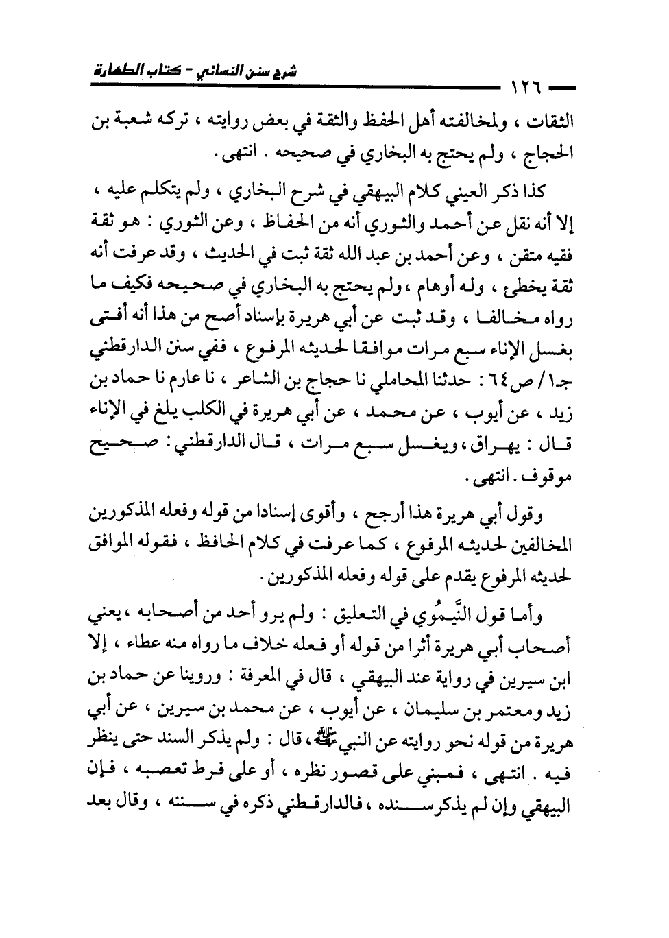 كذا ذكر العيني كلام البيهقي في شرح البخاري، ولم يتكلم عليه، إلا أنه نقل عن أحمد والثوري أنه من الحفاظ، وعن الثوري: هو ثقة فقيه متقن، وعن أحمد بن عبد الله ثقة ثبت في الحديث، وقد عرفت أنه ثقة يخطئ، وله أوهام، ولم يحتج به البخاري في صحيحه فكيف ما رواه مخالفا، وقد ثبت عن أبي هريرة بإسناد أصح من هذا أنه أفتى بغسل الإناء سبع مرات موافقا لحديثه المرفوع، ففي سنن الدارقطني جـ 1/ ص 64: حدثنا المحاملي نا حجاج بن الشاعر، نا عارم نا حماد بن زيد، عن أيوب، عن محمَّد، عن أبي هريرة في الكلب يلغ في الإناء قال: يهراق، ويغسل سبع مرات، قال الدارقطني: صحيح موقوف. انتهى.