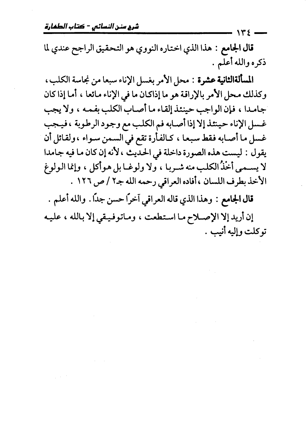 المسألة الثانية عشرة: محل الأمر بغسل الإناء سبعا من نجاسة الكلب، وكذلك محل الأمر بالإراقة هو ما إذا كان ما في الإناء مائعا، أما إذا كان جامدا، فإن الواجب حينئذ إلقاء ما أصاب الكلب بفمه، ولا يجب غسل الإناء حينئذ إلا إذا أصابه فم الكلب مع وجود الرطوبة، فيجب غسل ما أصابه فقط سبعا، كالفأرة تقع في السمن سواء، ولقائل أن يقول: ليست هذه الصورة داخلة في الحديث؛ لأنه إن كان ما فيه جامدا لا يسمى أخْذُ الكلب منه شربا، ولا ولوغا بل هو أكل، وإنما الولوغ الأخذ بطرف اللسان، أفاده العراقي رحمه الله جـ 2/ ص 126.