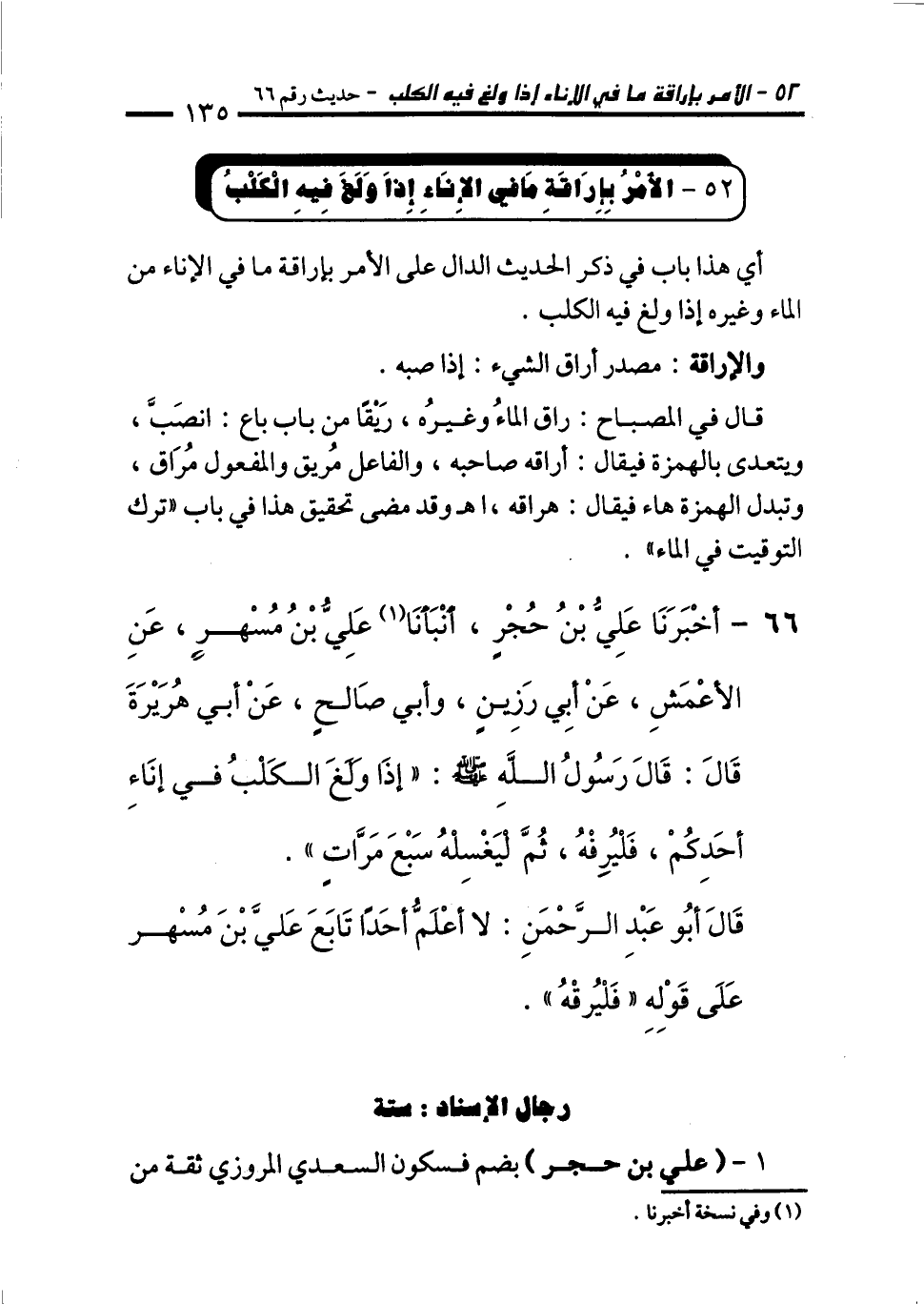 66 - أَخْبَرَنَا عَلِيُّ بْنُ حُجْرٍ، أَنْبَأَنَا (¬1) عَلِيُّ بْنُ مُسْهِرٍ، عَنِ الأَعْمَشِ، عَنْ أَبِي رَزِينٍ، وَأَبِي صَالِحٍ، عَنْ أَبِي هُرَيْرَةَ قَالَ: قَالَ رَسُولُ اللهِ - صلى الله عليه وسلم -: "إِذَا وَلَغَ الْكَلْبُ فِي إِنَاءِ أَحَدِكُمْ، فَلْيُرِفْهُ، ثُمَّ لْيَغْسِلْهُ سَبْعَ مَرَّاتٍ".